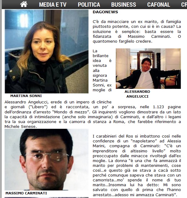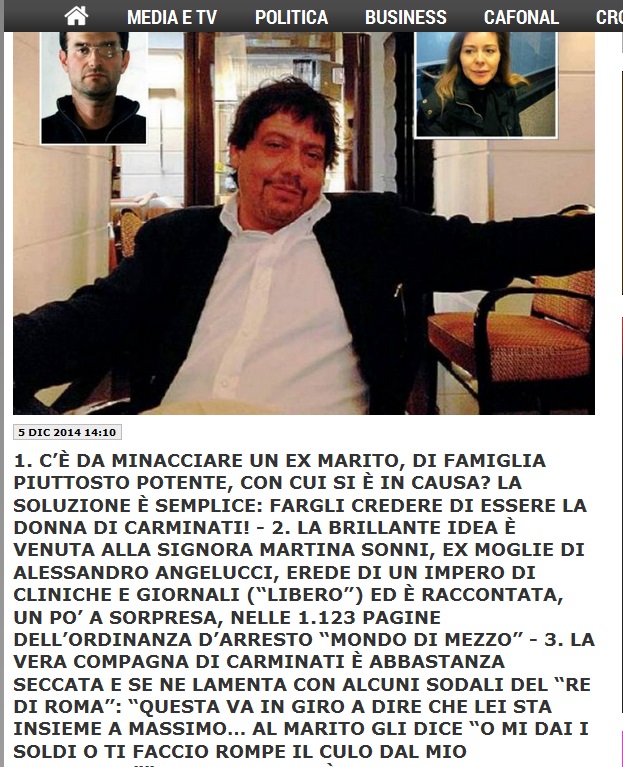 Secondo l’inchiesta la Sonni, in causa con Angelucci, avrebbe fatto credere al suo ex marito di essere la fidanzata di Massimo Carminati, per convincerlo ad essere più generoso con le somme devolute al “mantenimento”, l’incubo di qualunque uomo o donna divorziati con un reddito più alto di quello del coniuge.