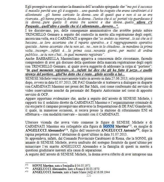 Ulteriore vicenda che aveva visto connesse le figure di SENESE Michele e di CARMINATI Massimo era collegabile alla figura di SONNI Martina, ex moglie di ANGELUCCI Alessandro, figlio dell’onorevole ANGELUCCI Antonio, dopo la rapina perpetrata presso l’abitazione di quest’ultimo in data 31.07.2013.