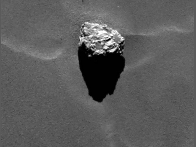 Largo 45 metri, il masso Cheope era stato visto già in agosto, nelle prime fasi di avvicinamento alla cometa, dalla fotocamera Osiris a bordo della sonda dell’Agenzia Spaziale Europea (Esa). Ma nelle ultime settimane gli scatti più ravvicinati, da una distanza di 28,5 chilometri, hanno permesso di rivelarne i dettagli e di delinearne meglio la forma, soprattutto l’ombra a forma di piramide proiettata sulla superficie della cometa.