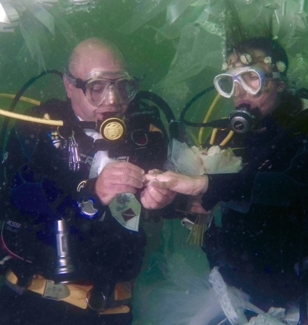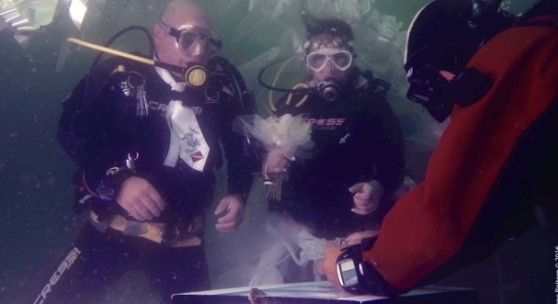 JESOLO – Elisa Nicorelli e Martino Pivato sono diventati marito e moglie sott’acqua. La coppia si è scambiata le fedi davanti ai testimoni, hanno scambiato le promesse leggendole sui cartelli alla presenza dei testimoni, hanno inciso le firme con una matita speciale su un registro. E poi la coppia, sempre sott’acqua si è scambiata un bel bacio. Questo insolito matrimonio è avvenuto a Jesolo in provincia di Venezia. Lo racconta con tanto di foto Il Mattino di Padova: