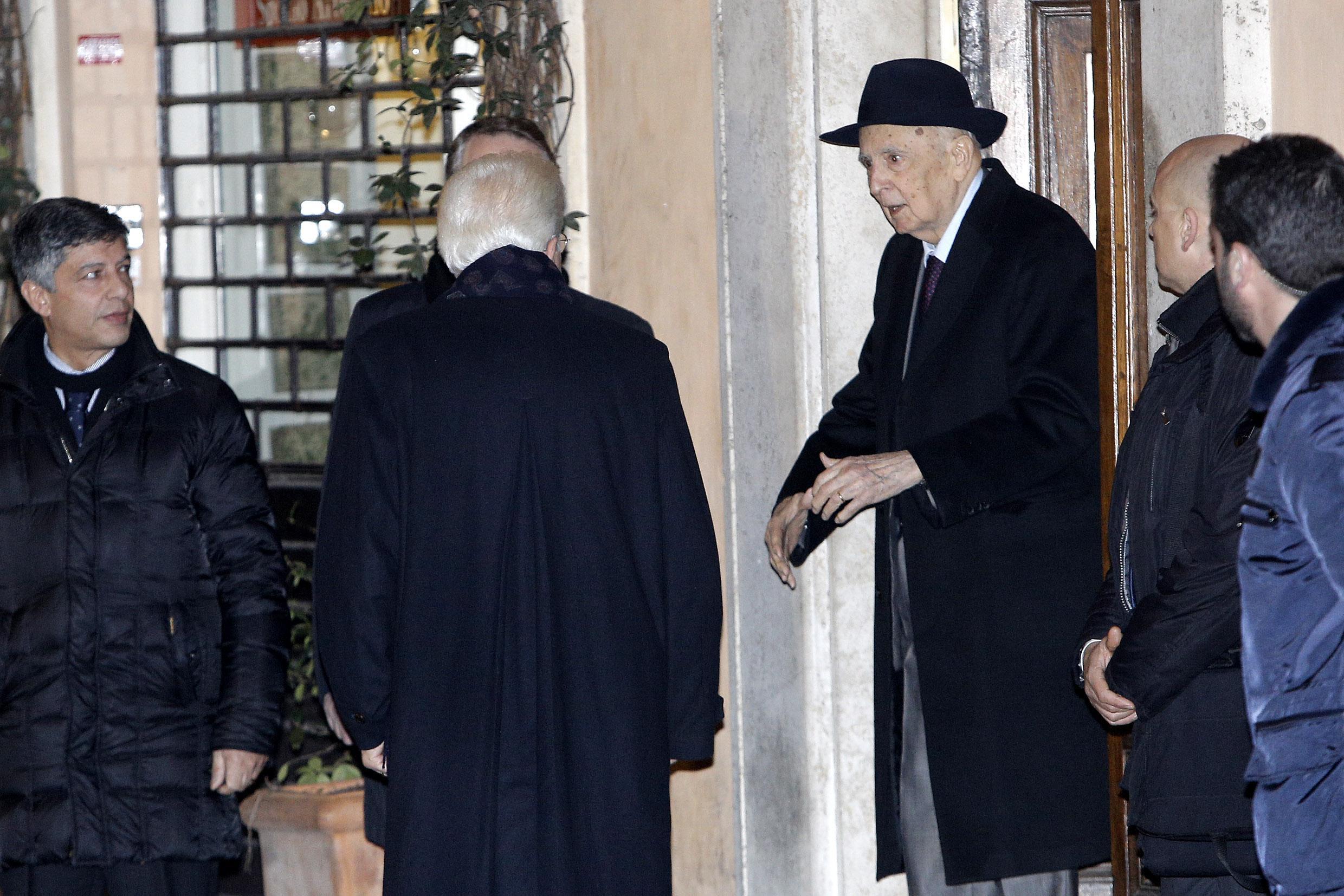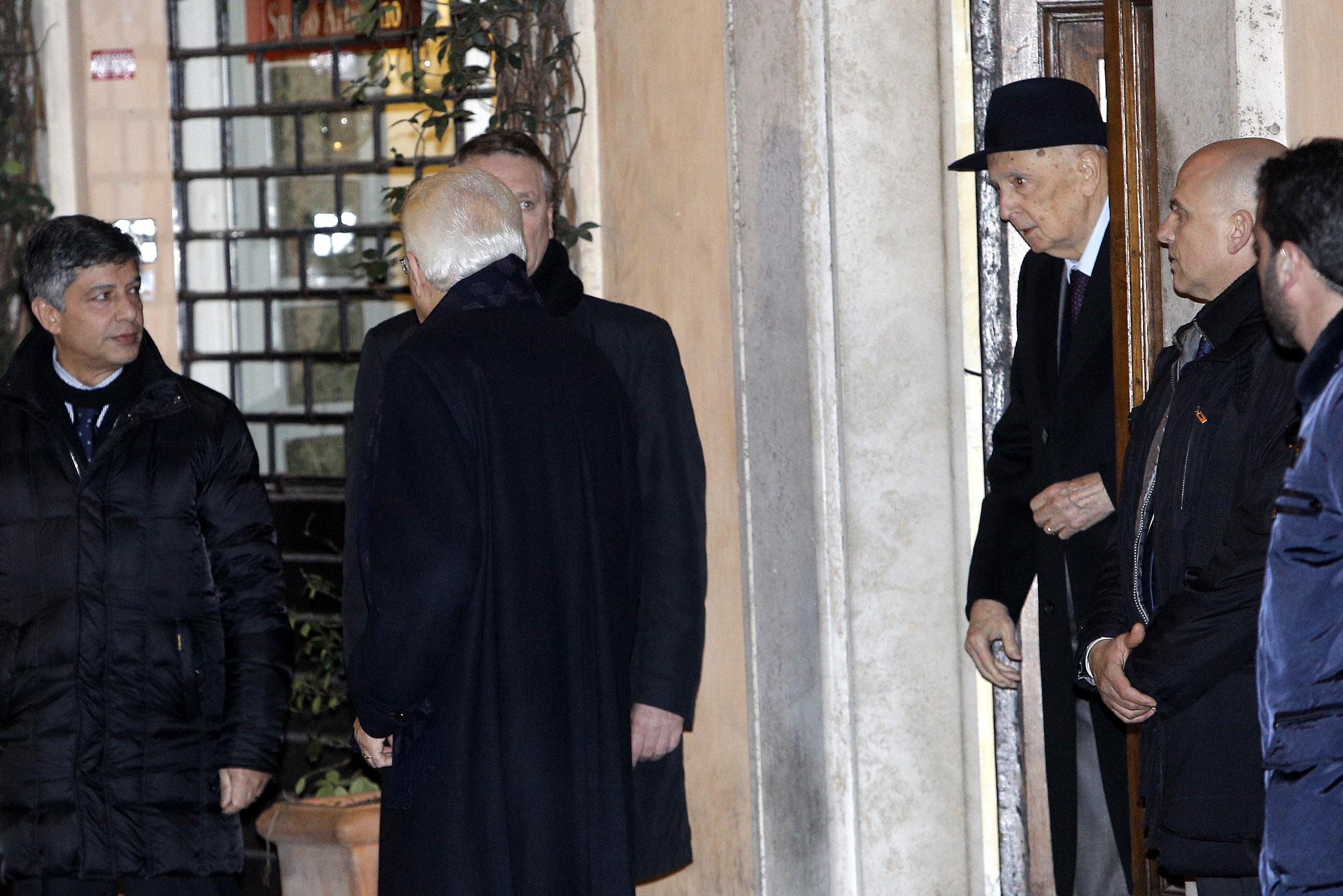 Poi Mattarella è tornato a piedi alla Consulta, accompagnato dalla scorta, senza però rilasciare dichiarazioni ai numerosi cronisti che l’hanno inseguito per tutto il tragitto. Nel pomeriggio Mattarella è arrivato a casa di Giorgio Napolitano, in vicolo dei Serpenti a Roma, per un colloquio privato. Il neo presidente della Repubblica ha percorso a piedi il breve tragitto che lo separa dalla foresteria della Corte Costituzionale all’appartamento nel rione Monti del presidente emerito.