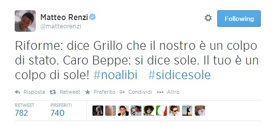 ROMA – La battaglia politica ormai è su Twitter: Beppe Grillo accusa Matteo Renzi di nascondere un “colpo di Stato” sotto il nome di “riforme”, Renzi lo corregge dicendo che si tratta di un “colpo di sole”, e sul social di microblogging spopola l’hashtag #sidicesole. Ma Filippo Sensi, il portavoce del premier, sul proprio account Nomfup, frena: “Ok, ok, ora levategli Twitter, per favore #cosedilavoro”.