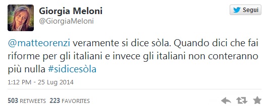 Ma la cosa non finisce qui. La leader di Fratelli d’Italia, Giorgio Meloni, dice la sua e twitta: @MatteoRenzi veramente si dice sòla. Quando dici che fai riforme per gli italiani e invece gli italiani non conteranno più nulla #sidicesòla.