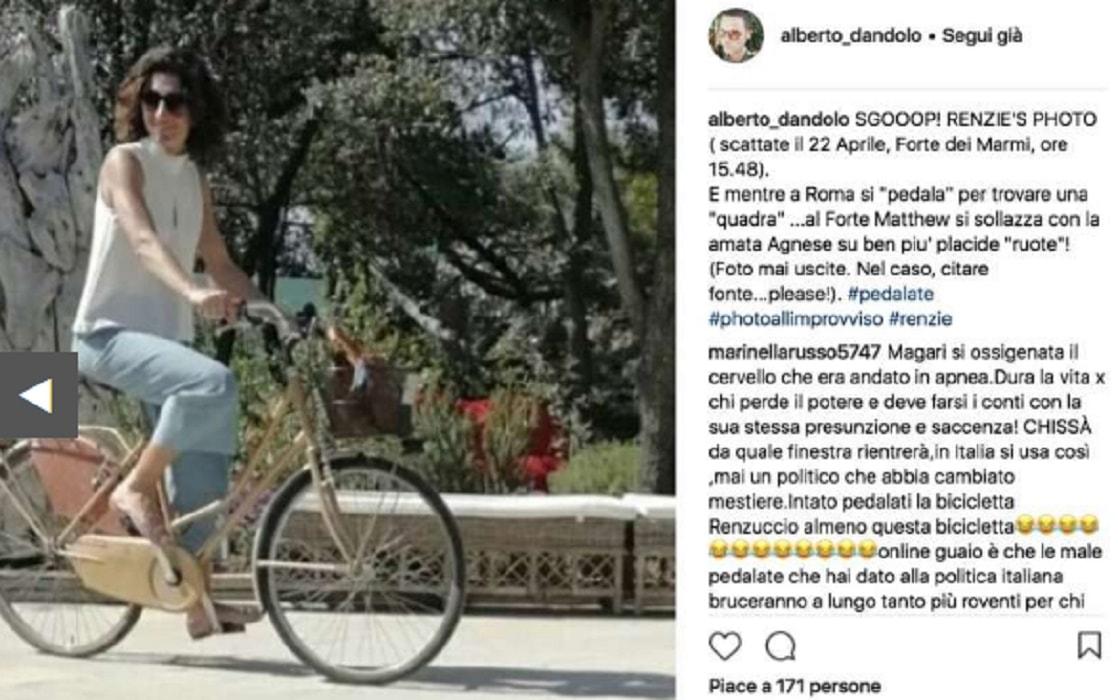 “SGOOOP! RENZIE’S PHOTO ( scattate il 22 Aprile, Forte dei Marmi, ore 15.48). E mentre a Roma si “pedala” per trovare una “quadra” …al Forte Matthew si sollazza con la amata Agnese su ben piu’ placide “ruote”! (Foto mai uscite. Nel caso, citare fonte…please!). #pedalate#photoallimprovviso#renzie”.
