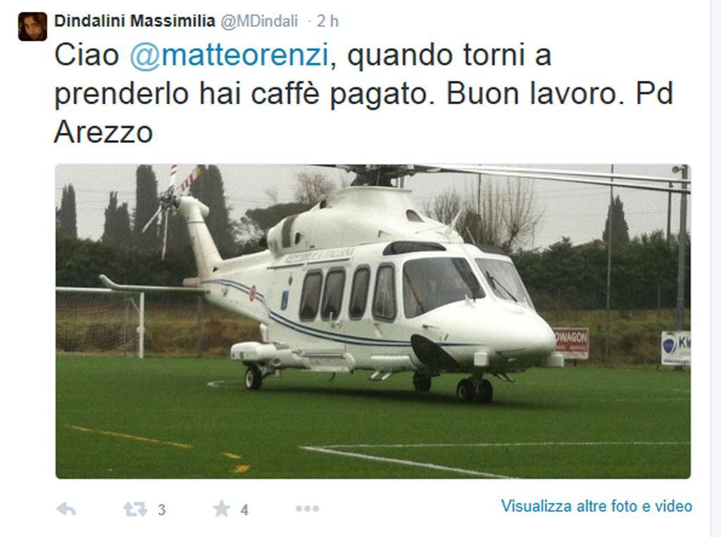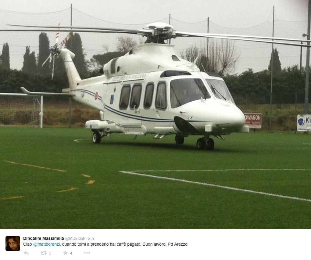 L’elicottero è atterrato in un campo sportivo senza problemi. Renzi è stato raggiunto dalla scorta ed ha proseguito il viaggio per Roma in auto. Nessuna conseguenza per il presidente del Consiglio né per gli altri occupanti, equipaggio e personale di scorta. Il piccolo incidente non ha tolto al premier la voglia di Twittare. Poco dopo, infatti, Renzi ha commentato i dati più recenti sull’occupazione