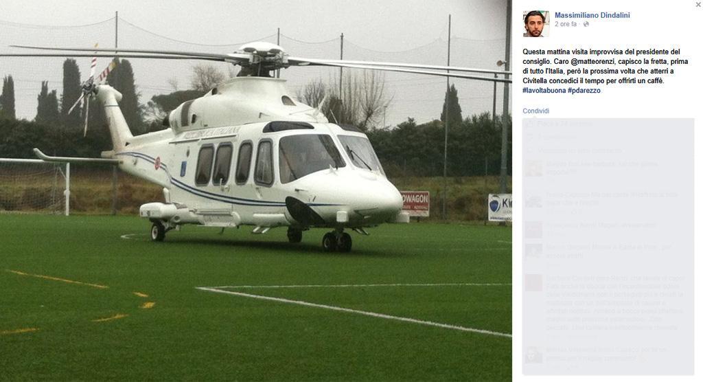 AREZZO – Mattinata con piccolo brivido per Matteo Renzi. L’elicottero che portava il premier da Firenze a Roma è stato infatti costretto ad un atterraggio di emergenza nei pressi di Arezzo, a Badia al Pino, per il maltempo. In un primo tempo si era parlato di un guasto meccanico, ma poco dopo una nota ufficiale di Palazzo Chigi ha smentito questa ipotesi, spiegando che l’atterraggio di emergenza era stato deciso a causa delle cattive condizioni meteo.