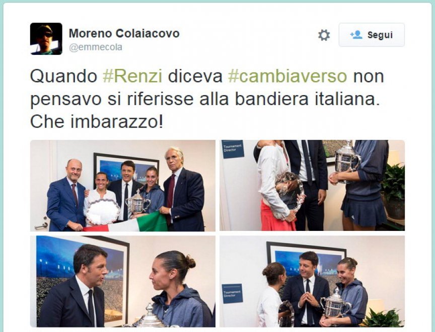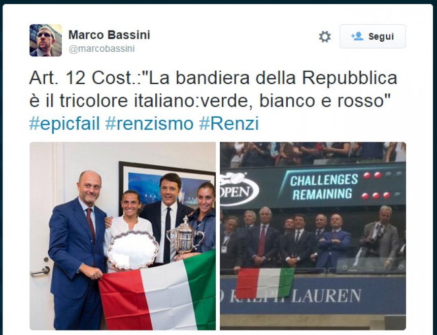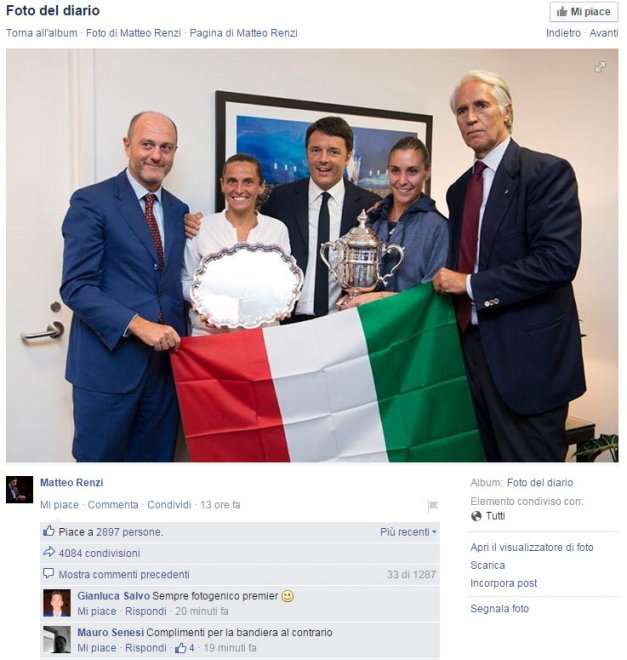 Dopo averlo visto esultare con il presidente del Coni Giovanni Malagò sugli spalti del Flushing Meadows, Renzi si è concesso diversi scatti con le due campionesse italiane, posando in una foto con la bandiera tricolore in bella mostra. Peccato però che la bandiera fosse anche al contrario.