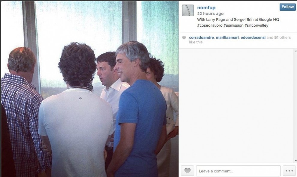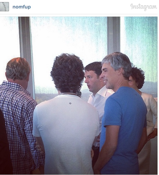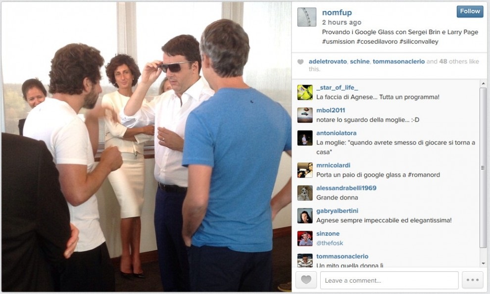 SAN FRANCISCO – Matteo Renzi, durante il suo viaggio nella Silicon Valley, si toglie lo sfizio di provare i Google Glass. Nelle foto pubblicate dal portavoce del premier Filippo Sensi tramite il suo profilo su Instagram. Accanto a Renzi c’è la moglie Agnese Landini e i fondatori del colosso di Mountain View Sergey Brin e Larry Page.