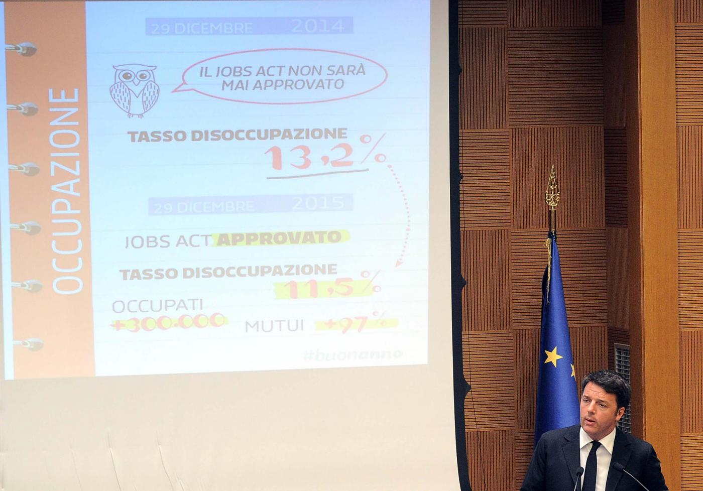 “In ottemperanza a ciò che so apprezzate molto ho portato delle slide”, scherza Renzi in apertura, approfittando però dell’occasione per togliersi qualche sassolino dalle scarpe. “Adesso i fatti e le vostre opinioni, sbagliate”, attacca, smentendo i virgolettati dubbiosi affidati ai gufi, che nelle slide prendono vita con dei fumetti. Dal Jobs act all’Italicum, dalla P.a. alla buona scuola Renzi descrive un’Italia “che diventa grande”. “Il 2015 è andato meglio del 2014, delle nostre previsioni nel 2014. È stato un buon anno”, taglia corto.