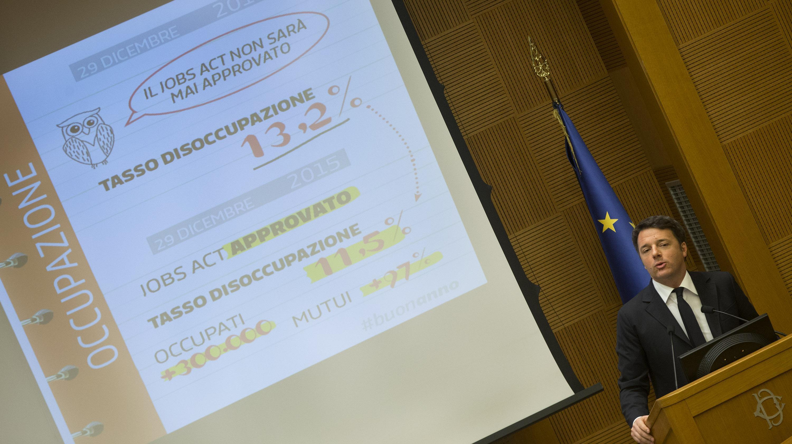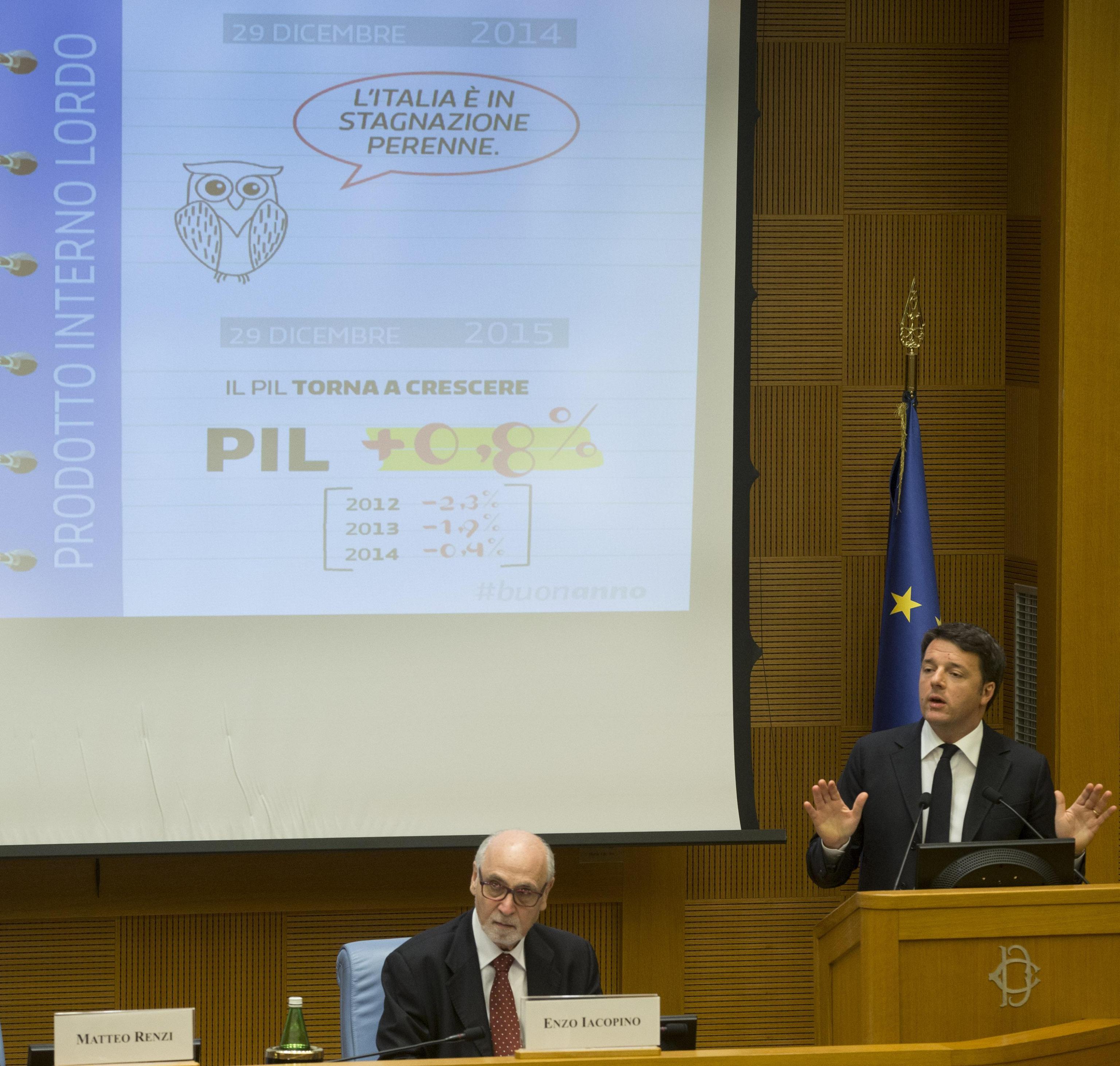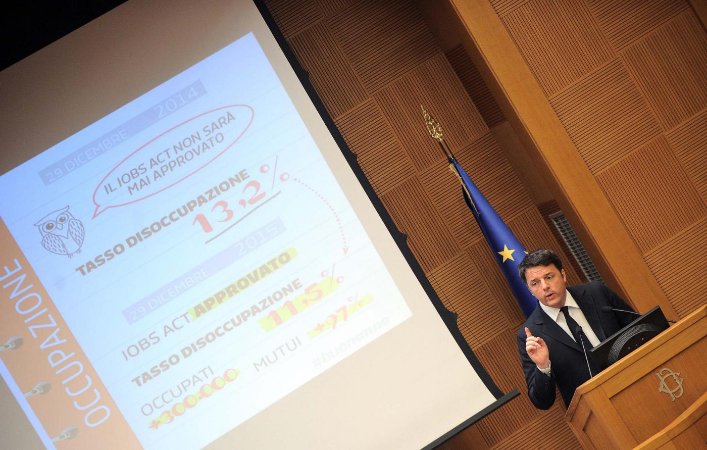 DI NUOVO LEADER – “Questo 2015 ha portato chiarezza in Italia. Ora ci sono più tutele e più posti di lavoro” ha poi aggiunto “Non basta, non sono ancora soddisfatto – aggiunge – lo sarò quando l’Italia sarà leader in Europa perché questo accadrà, piaccia o non piaccia”. Ed ecco le foto delle slide con i gufi.