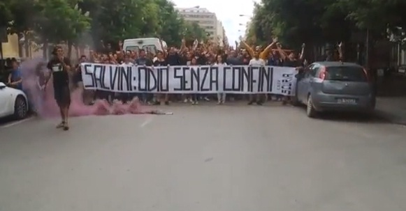 FOGGIA – Matteo Salvini arriva a Foggia e i manifestanti lanciano fumogeni, uova, banane e pomodori contro l’ingresso del suo albergo. Poi la polizia carica e partono gli scontri. Una ragazza viene ferita alla testa e dev’essere medicata dai sanitari del 118.