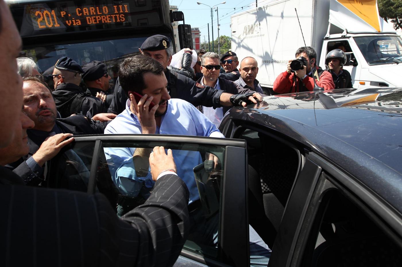 NAPOLI – “Sei tu la carogna”, gridano a Matteo Salvini i manifestanti arrivati in piazza Carlo III a Napoli la mattina del 6 maggio. L’accoglienza per il leader della Lega Nord non è delle migliori: insulti e proteste, con tanto di bandiere delle Due Sicilie. Il leghista Salvini rinuncia così a tenere il comizio previsto, sale sulla sua auto e abbandona la piazza.