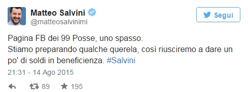Ha cominciato Salvini scrivendo su Twitter: “Pagina FB dei 99 Posse, uno spasso. Stiamo preparando qualche querela, così riusciremo a dare un po’ di soldi in beneficienza. #Salvini”.