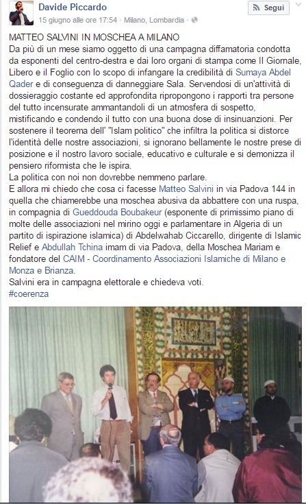 MILANO – Matteo Salvini in una moschea a chiedere voti. A scriverlo è Davide Piccardo del CAIM, il Coordinamento associazioni islamiche di Milano e Monza e Brianza, sul suo profilo Facebook. La dichiarazione è accompagnata da una foto che risale a circa 15 anni fa. All’epoca, Salvini era un giovane consigliere comunale di Milano.