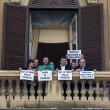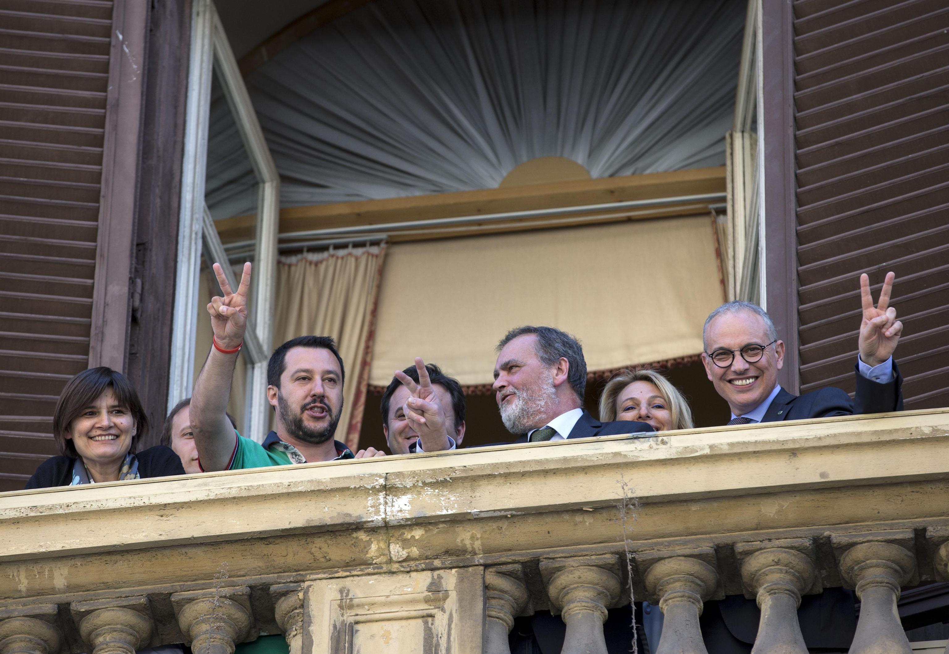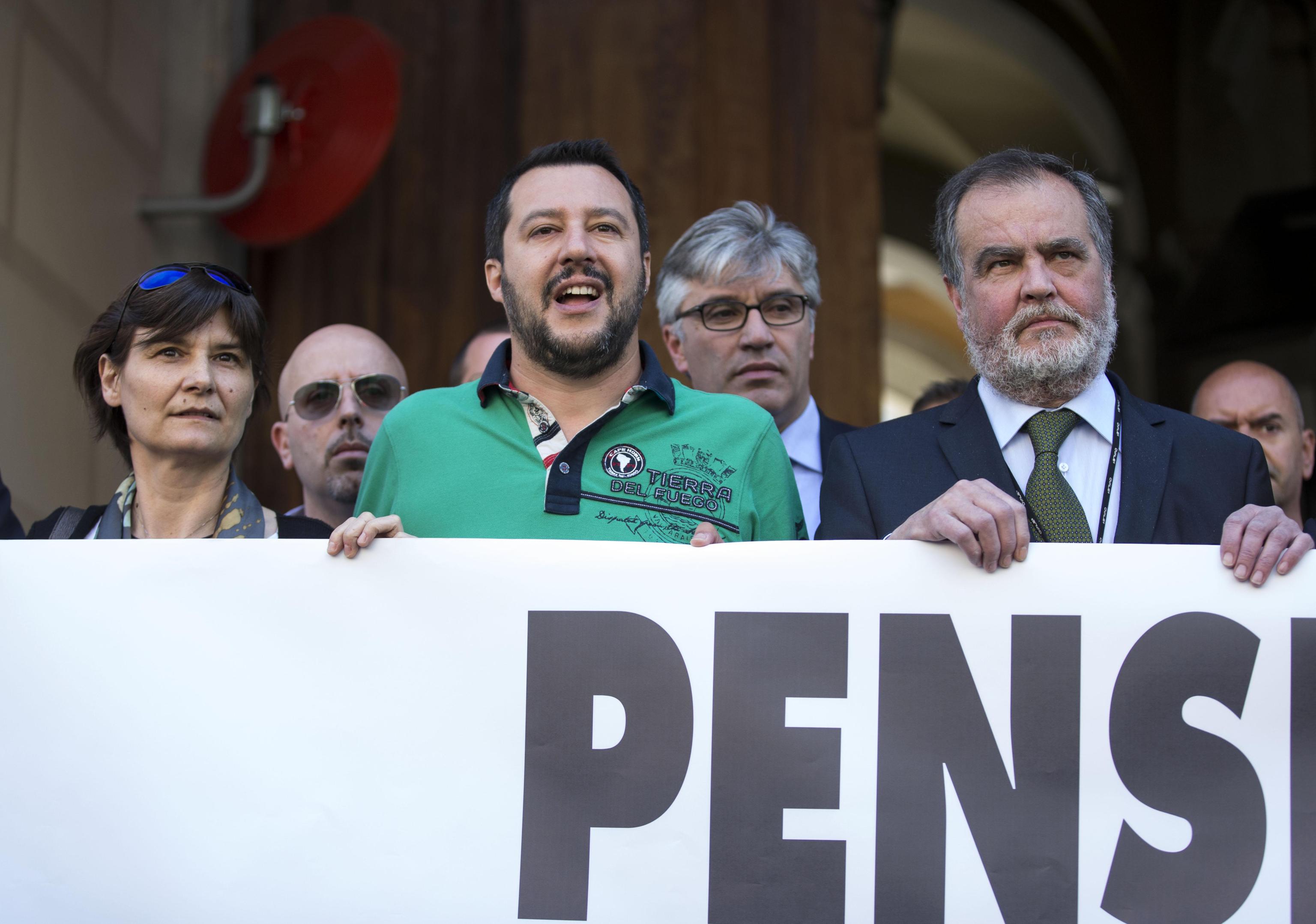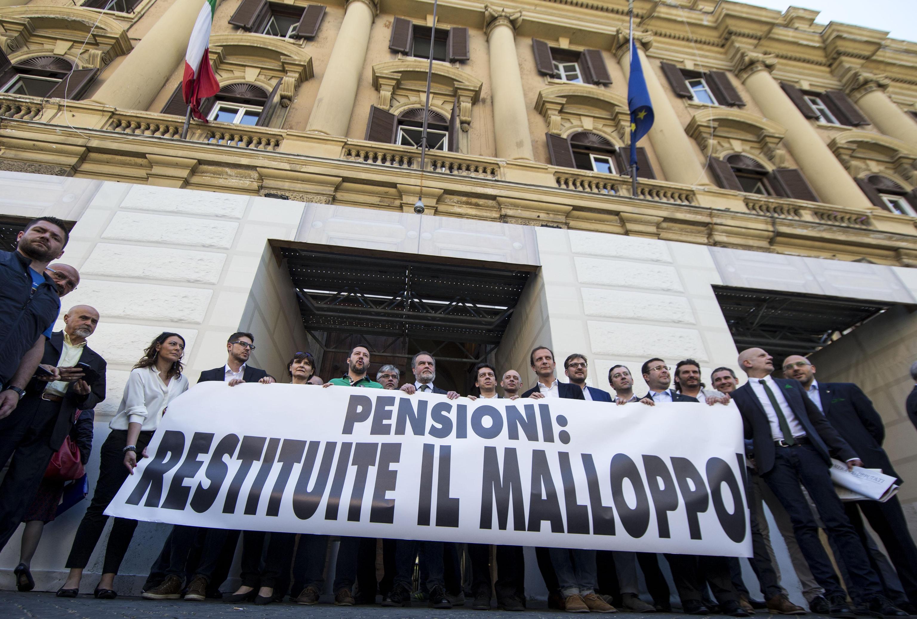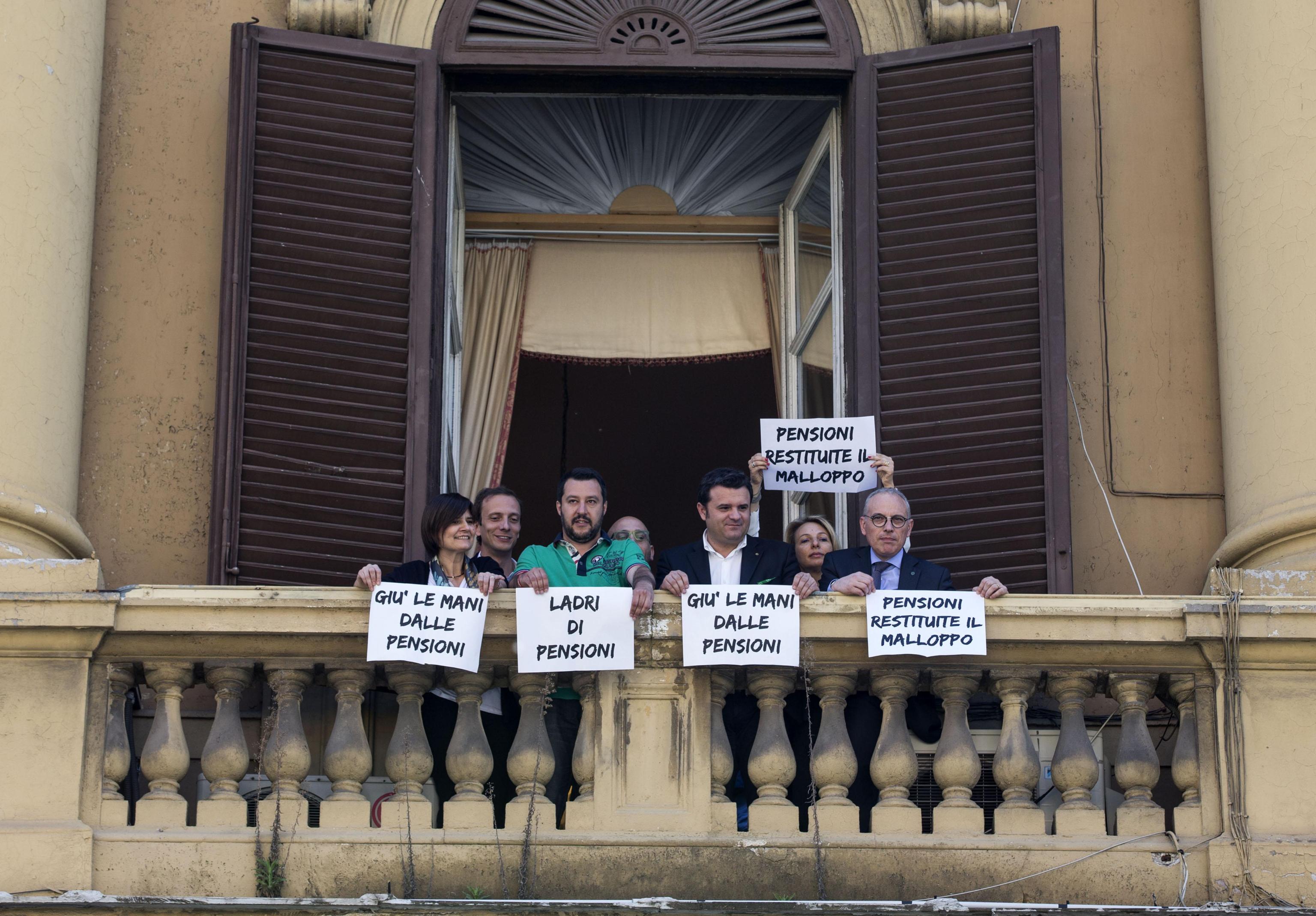 ROMA – Il leader della Lega, Matteo Salvini, insieme ad altri deputati e senatori, stanno per entrare nella sede del ministero dell’Economia dove, annuncia Salvini “ci resteremo fino a quando non avremo delle risposte”. Salvini si è affacciato ad un balcone ed insieme ad altri parlamentari ha esposto diversi cartelli. Il leader della Lega ha fatto il segno di vittoria. Sui cartelli slogan come: “Giù le mani dalle pensioni”, “Ladri di Pensione”, “Restituite il malloppo”.