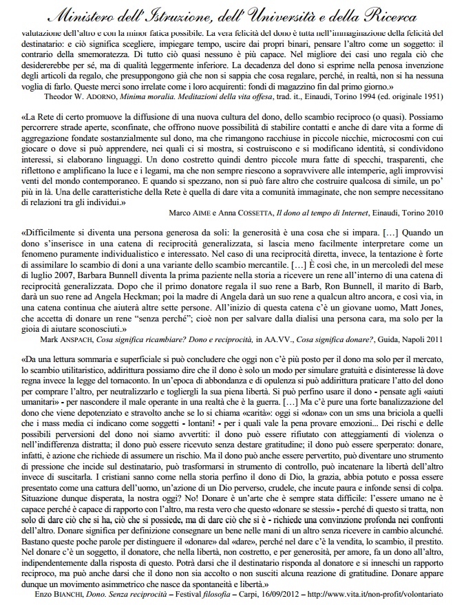 Luce IRIGARAY, Condividere il mondo, Bollati Boringhieri, Torino 2009 (ed. originale 2008) «Ogni essere umano deve disporre di una “cittadinanza mondiale”. Nessuno deve essere più “apolide”. Ciascuno deve sentirsi a casa propria sulla terra. Chiunque deve avere il diritto di lasciare il proprio paese d‟origine e di essere accolto, almeno temporaneamente, in qualsiasi altro luogo. […] Reciprocamente, ogni essere umano ha dei doveri nei confronti degli altri essere umani, delle generazioni che verranno, delle altre specie viventi e del pianeta. L‟umanità ha in particolare il dovere di mostrare empatia verso le generazioni future e verso le altre specie necessarie alla sua sopravvivenza. Deve quindi considerare come suo dovere creare le condizioni perché le prossime generazioni e le altre specie possano esercitare i loro diritti. Deve disporre di un accesso a tutte le sue risorse e, in particolare, alla ricchezza accumulata.»