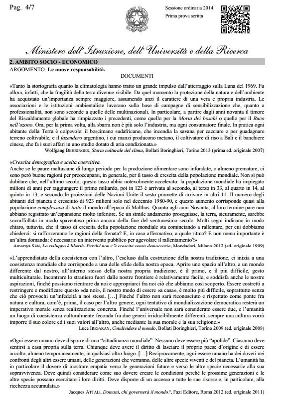 ROMA – “Le nuove responsabilità” è questo il titolo della traccia proposta nell’opzione saggio breve (ambito socio-economico) della prima prova di Maturità.