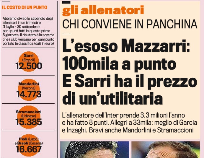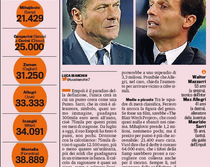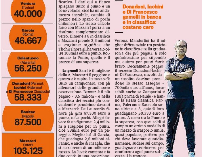 Se Mazzarri è il più costoso Maurizio Sarri dell’Empoli è il più economico. Stipendio: 300mila euro netti all’anno, 75mila in questo primo trimestre. Punti fin qui realizzati: 6. Quindi: 12.500 euro a punto.