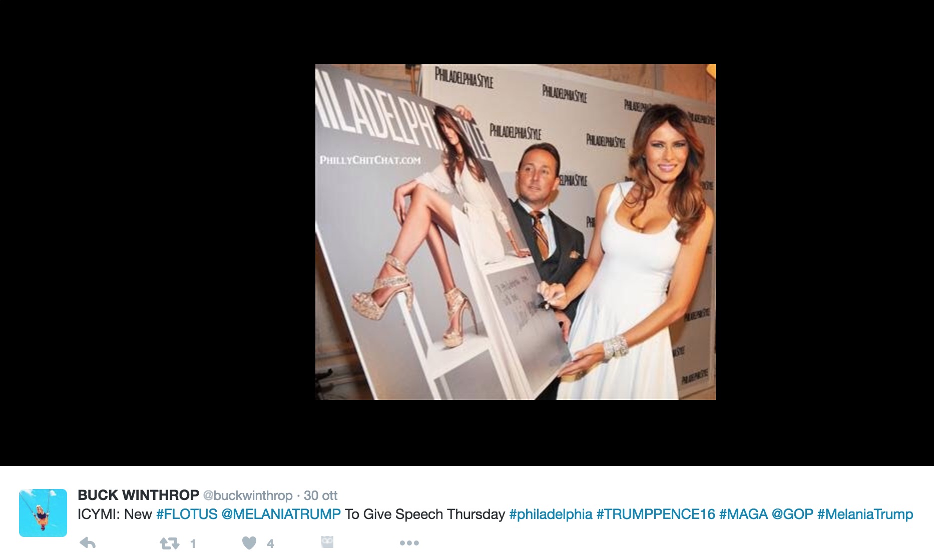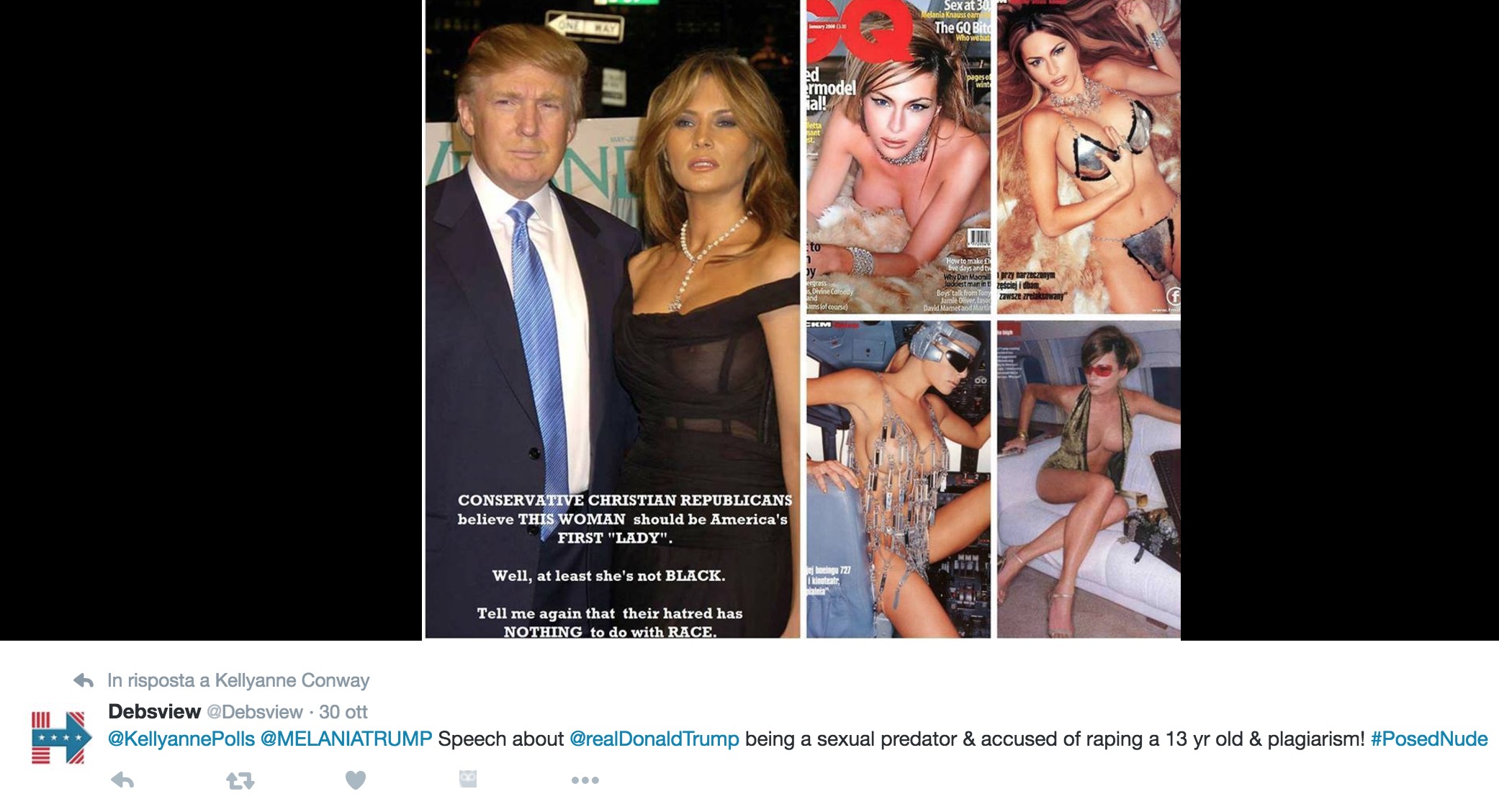 4 novembre. Discorso Melania Trump, sospetti su nuovo plagio. Melania Trump accusata di nuovo di plagio. Secondo quanto riferisce Huffington Post, alcuni passaggi dell’unico comizio elettorale tenuto dalla moglie del candidato repubblicano alla presidenza in Pennsylvania sarebbero stati copiati da un’intervista rilasciata nel 2011 dall’ex moglie di Trump, Marla Maples.