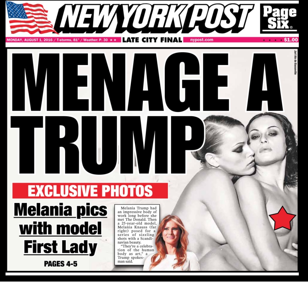 31 luglio: New York Post pubblica foto senza veli di Melania – Il New York Post, tabloid di proprietà di Rupert Murdoch, pubblica oggi in prima pagina una foto dei Melania Trump senza veli. L’immagine particolarmente rivelatrice risale al 1995 quando Melania faceva la modella e fu scattata per una rivista francese. Il richiamo in prima promette poi un più vasto servizio all’interno, con foto esclusive, di Melania Trump “come non l’avete mai vista”. Non è la prima volta che emergono fotografie della aspirante first lady del periodo in cui faceva la modella con discreto successo, cui il candidato Donald Trump ha in passato risposto affermando che si trattava della sua carriera. Quella pubblicata oggi in prima dal Post appare tuttavia come la piu’ audace delle foto diffuse fino ad ora.