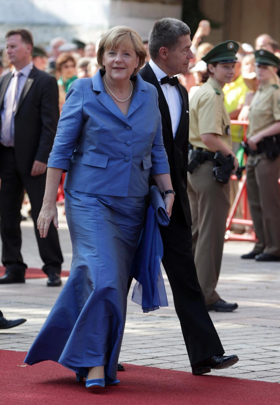 Merkel, ha fatto notare l’agenzia Dpa, come nel 2013 è comparsa nel pomeriggio davanti ai fotografi schierati sulla tradizionale Collina verde di Bayreuth con una giacca blu a tre bottoni e una gonna lunga fino ai piedi. In mano una pochette dello stesso colore dell’abito e al collo un semplice giro di perle. Ad accompagnarla il marito Joachim Sauer in frac (lo stesso dell’anno precedente, verrebbe da pensare).