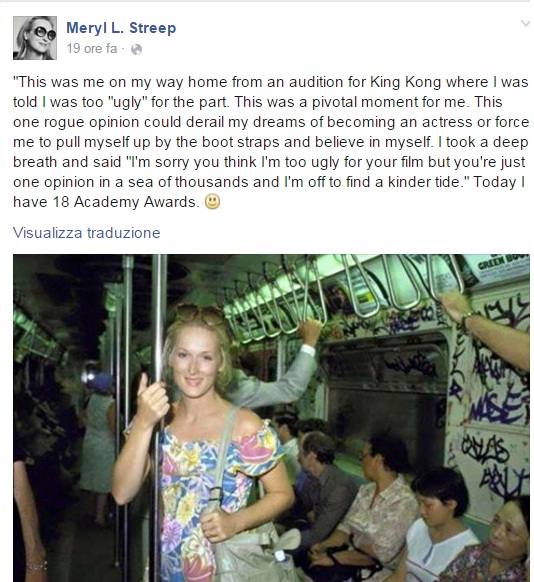 LOS ANGELES – Le dissero che era troppo brutta per fare l’attrice, ma lei non ha rinunciato al suo sogno. Così, tanti anni dopo e 18 Oscar vinti all’attivo, Meryl Streep racconta su Facebook la delusione per quel provino, uno dei primi della sua carriera che l’ha portata ad essere una delle attrici più amate e premiate di Hollywood. “Al provino per King Kong mi dissero sei troppo brutta, avrei potuto buttarmi giù ma non l’ho fatto: oggi ho 18 Oscar”, dice l’attrice per incoraggiare chi come lei ha avuto la forza di inseguire il suo sogno.