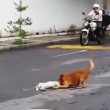 Anche il secondo cane ha rischiato di essere investito, ma fortunatamente l’auto che ha investito il suo amico lo ha evitato. Il secondo cane ha quindi provato a trascinare via dalla strada il suo amico morto. Non riuscendoci ha deciso di fermarsi là sedendosi accanto al corpo dell’altro cane.