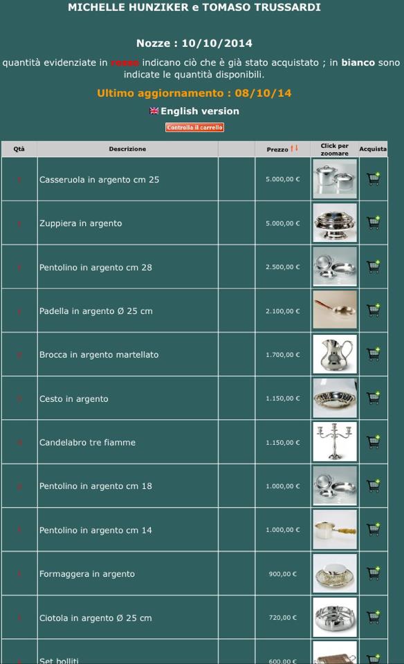 ROMA – Le nozze tra Michelle Hunziker e Tomaso Trussardi sono previste per domani, sabato 10 ottobre. A poche ore dall’evento, spunta su Facebook, grazie a Selvaggia Lucarelli su segnalazione di un giornalista di Novella 2000, la lista di nozze scelta dai futuri sposi.