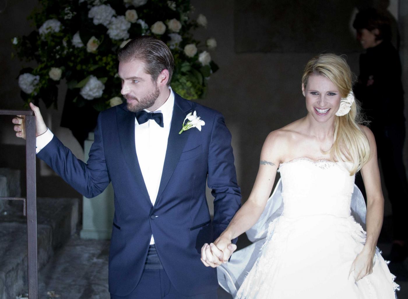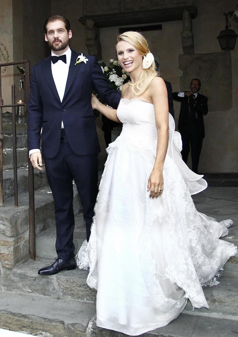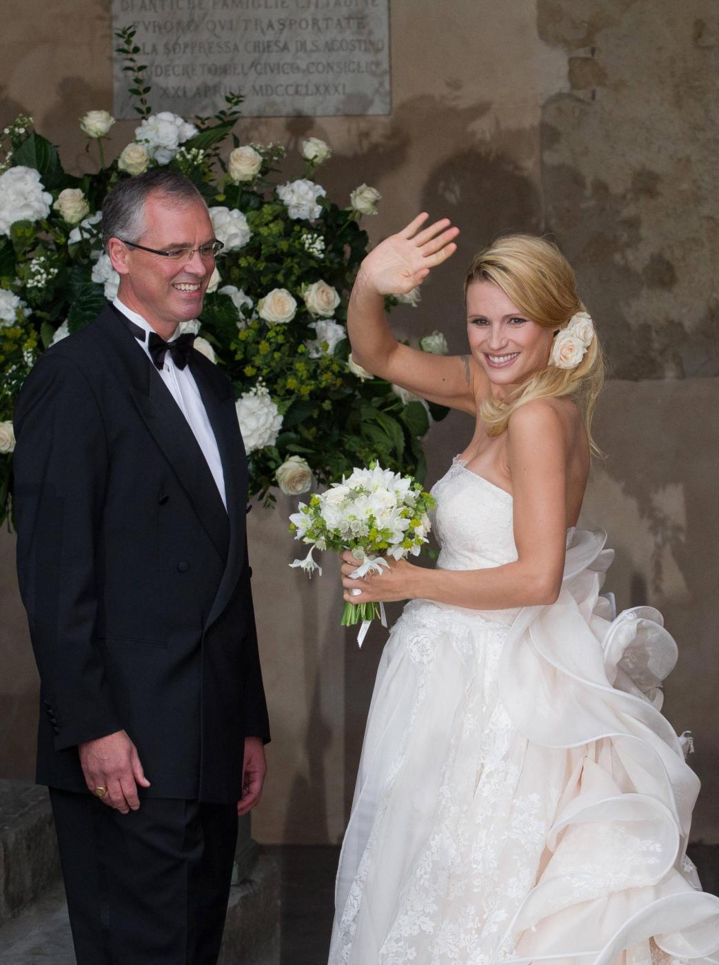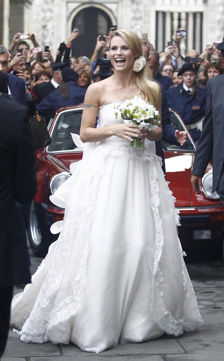 Lo sposo è arrivato in piazza accompagnato dalla sorella Gaia. Michelle, raggiante in un lungo abito da principessa in cadì di seta color cipria, è giunta dieci minuti prima delle 17 a bordo di una Porsche. Con lei le due figlie: Aurora, nata dal primo matrimonio con Eros Ramazzotti, e la piccola Sole, che proprio oggi compie un anno ed è figlia di Tomaso.