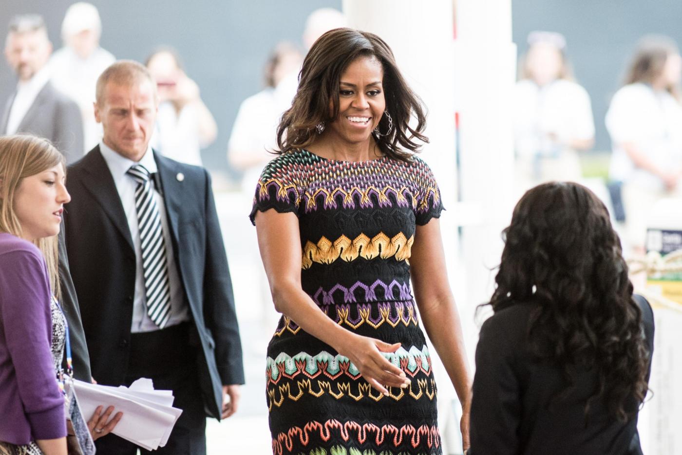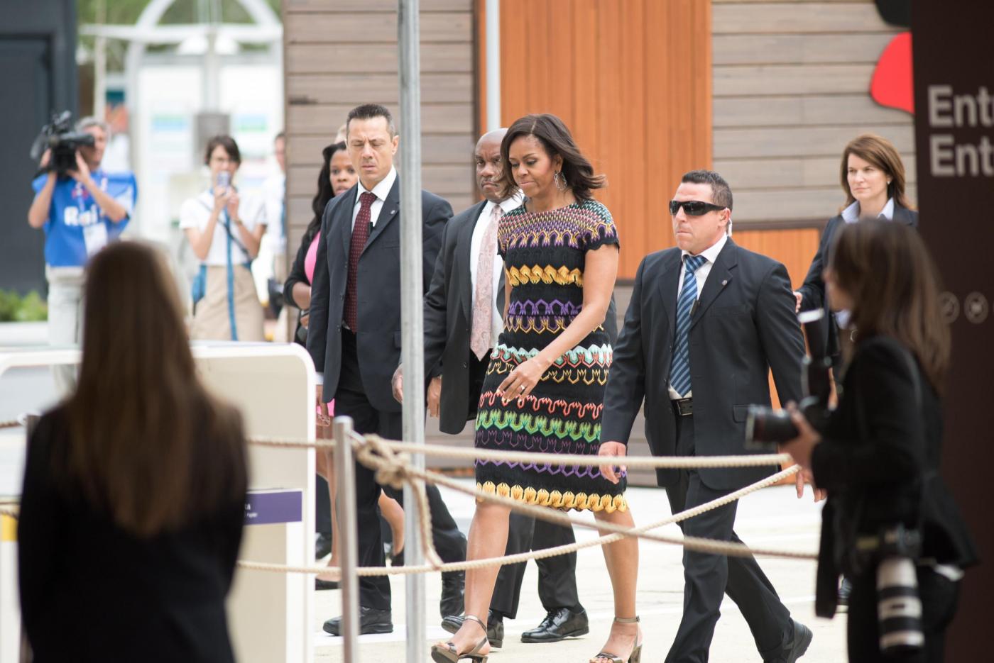 MILANO – Nella sua gita milanese all‘Expo Michelle Obama ha visitato anche il Padiglione Italia. La first lady degli Stati uniti ha indossato per l’occasione un coloratissimo abito firmato Missoni. Ad accompagnarla gli studenti della International School di Baranzate (Milano).
