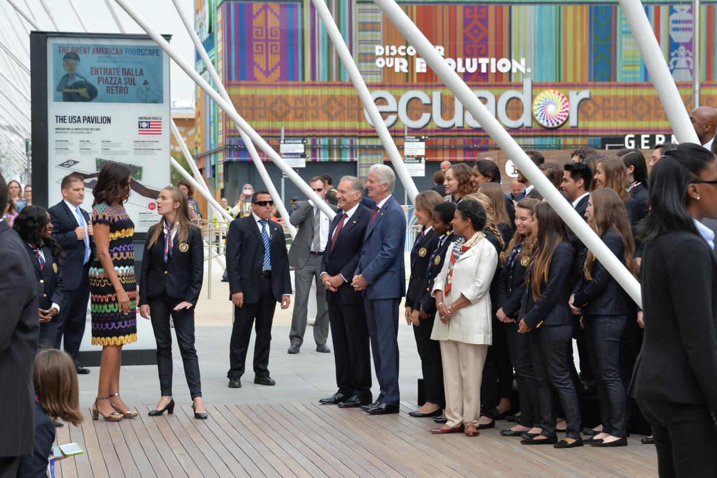 Michelle Obama è stata accolta al padiglione italiano da Agnese Landini, moglie del premier Matteo Renzi, dal commissario unico di Expo, Giuseppe Sala, dal ministro delle Politiche Agricole, Maurizio Martina, dalla presidente di Expo, Diana Bracco e da Emma Bonino. Alla leader radicale Michelle ha domandato come stesse, poi le due donne hanno parlato dell’iniziativa ‘Women for Expo’.