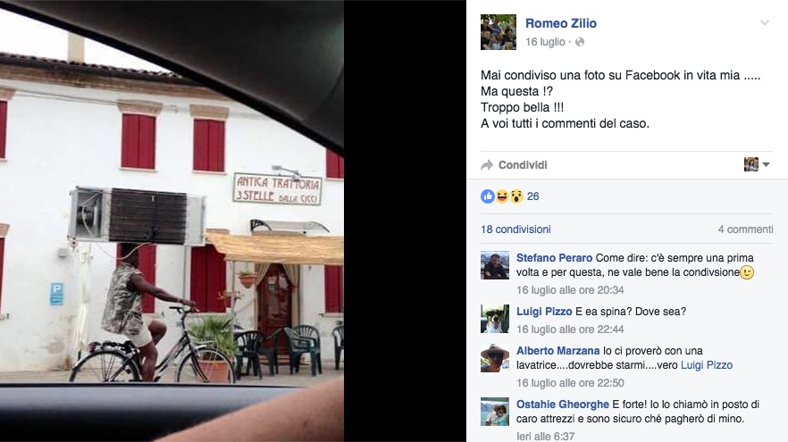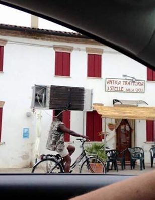 “Non è certo passato inosservato il profugo che ha trasportato, pare con una certa disinvoltura, un frigorifero sulla testa pedalando in sella a una bici per alcuni chilometri da San Siro d Agna fino a Conetta. Il forzuto ed equilibrista ospite del centro profughi dell’ex base in territorio veneziano pare abbia trovato il vecchio frigorifero davanti ad una abitazione fra Agna e San Siro di Bagnoli. I proprietari lo avevano lasciato fuori dal cancello in attesa del passaggio della ditta incaricata dello smaltimento.
