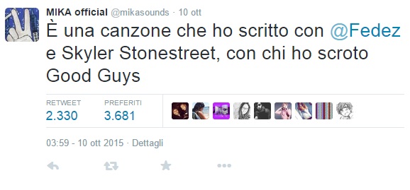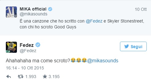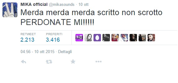 ROMA – Mika รจ un bravissimo cantante e simpatico giudice di X Factor Italia, ma qualche volta ha ancora problemini con l’italiano. Accade allora che al cantante scappi, ingenuamente, qualche parola non proprio appropriata e fuori contesto. Stavolta a tradirlo รจ un tweet decisamente piccante, dove al posto di “scritto” usa “scroto“. E il popolo di Twitter si lascia andare a commenti decisamente divertenti, in primis Fedez che ride col giudice e collega di X Factor.