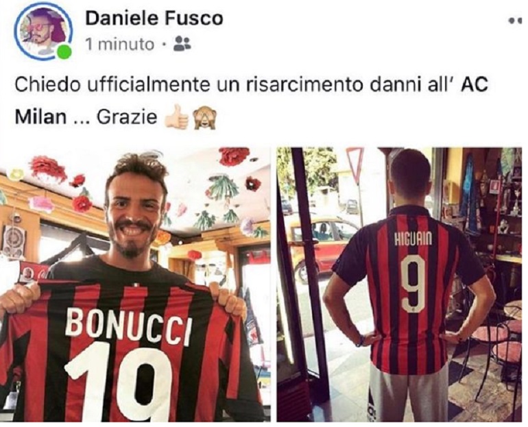 ROMA – Un tifoso del Milan, su Instagram, mostra le maglie di Leonardo Bonucci e Gonzalo Higuain: “Chiedo – scherza – ufficialmente un risarcimento danni all’AC Milan”. In effetti, il tifoso rossonero, non è stato certo fortunato nella scelta delle maglie.