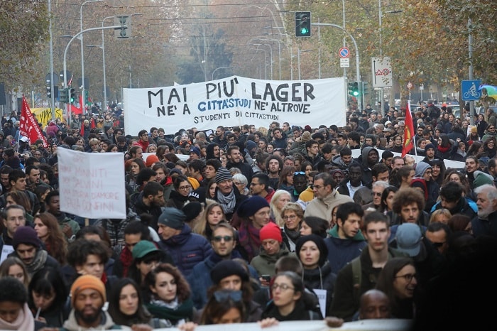 Alla manifestazione, che ha preso il via alle 16 da piazza Piola, hanno preso parte non solo i giovani dei centri sociali e la rete di ‘Mai piu’ lager-No ai Cpr’ ma anche, con le loro bandiere, la Camera del Lavoro, Arci, Rifondazione Comunista, Cgil, Fiom, Pci, e Cobas.