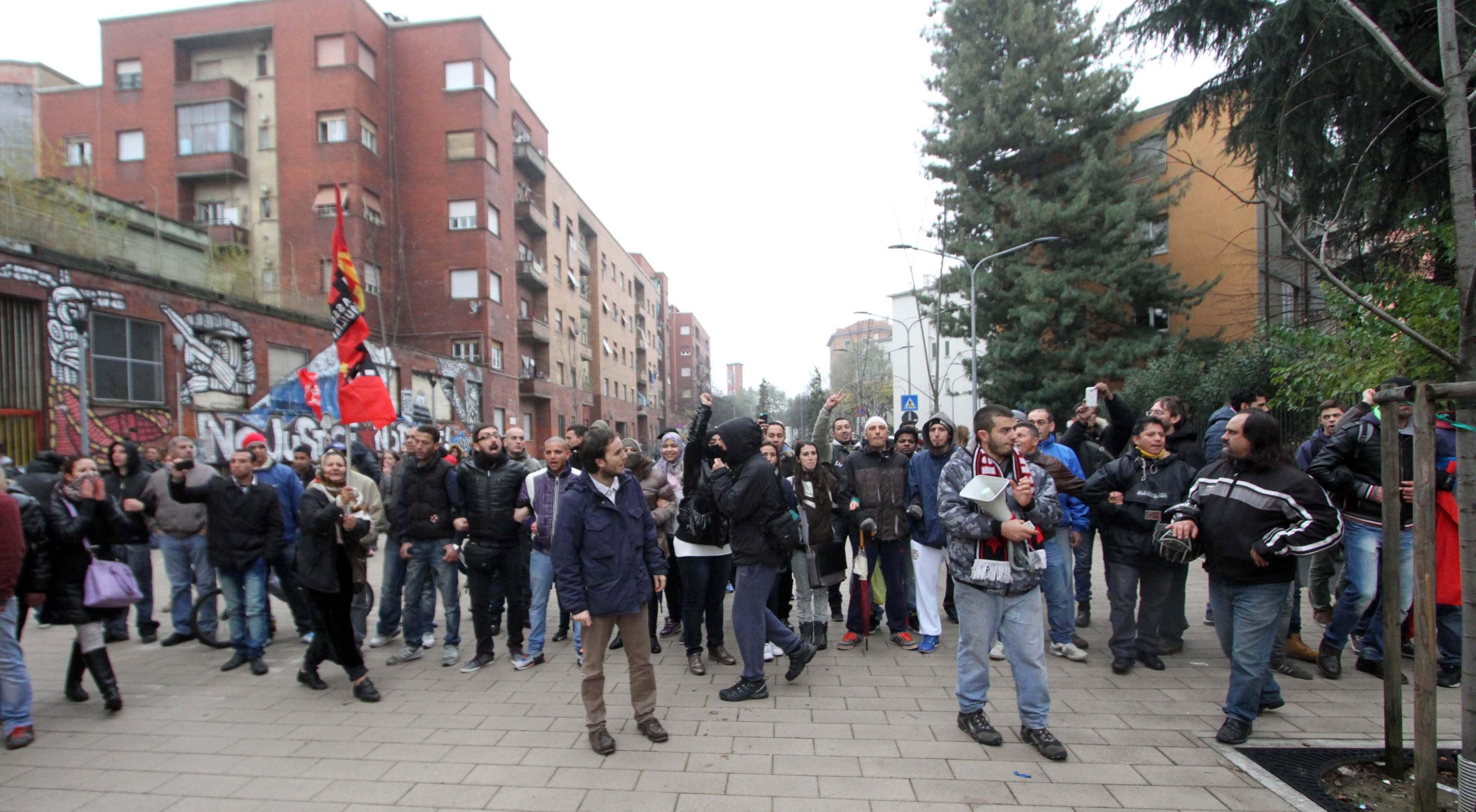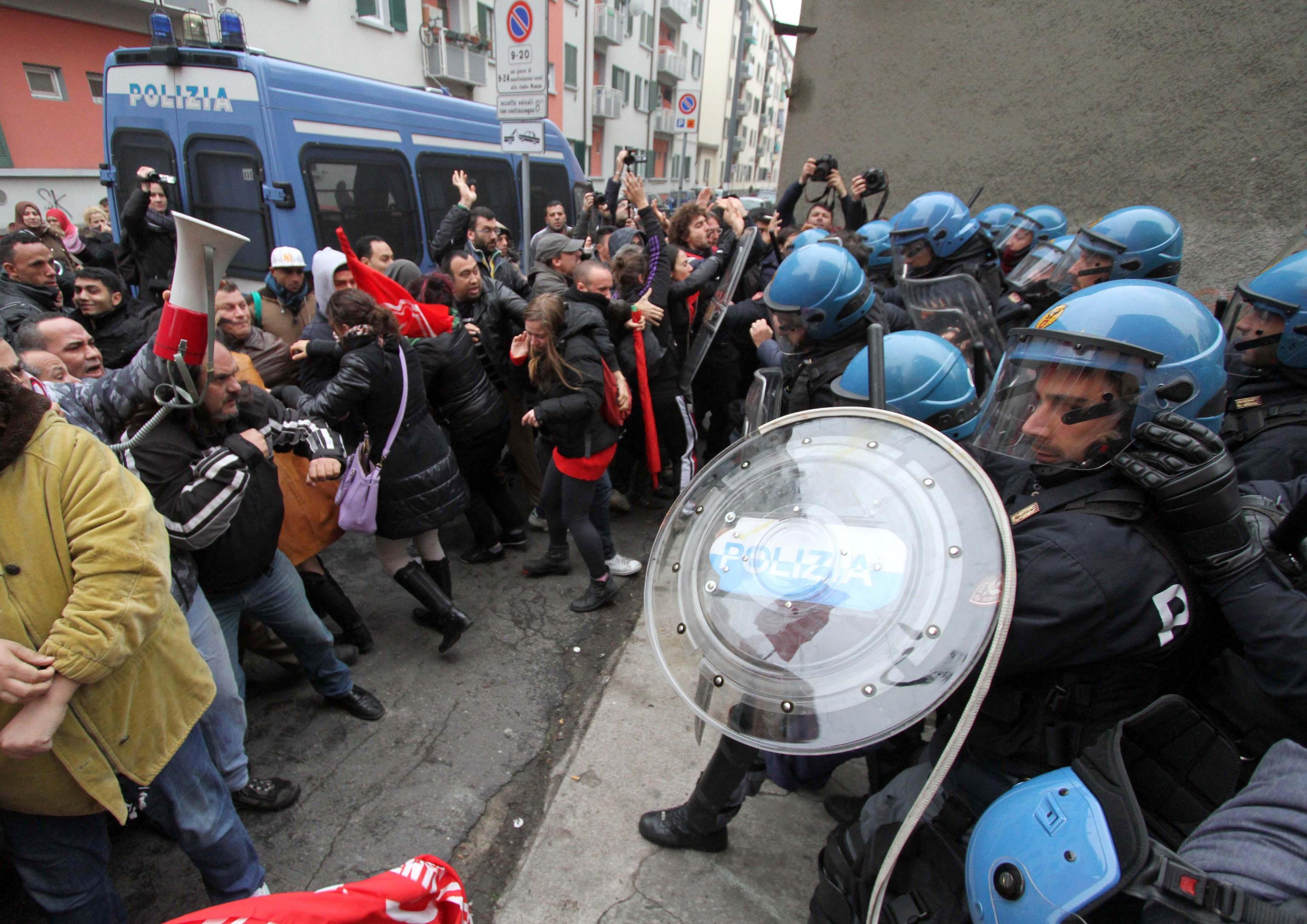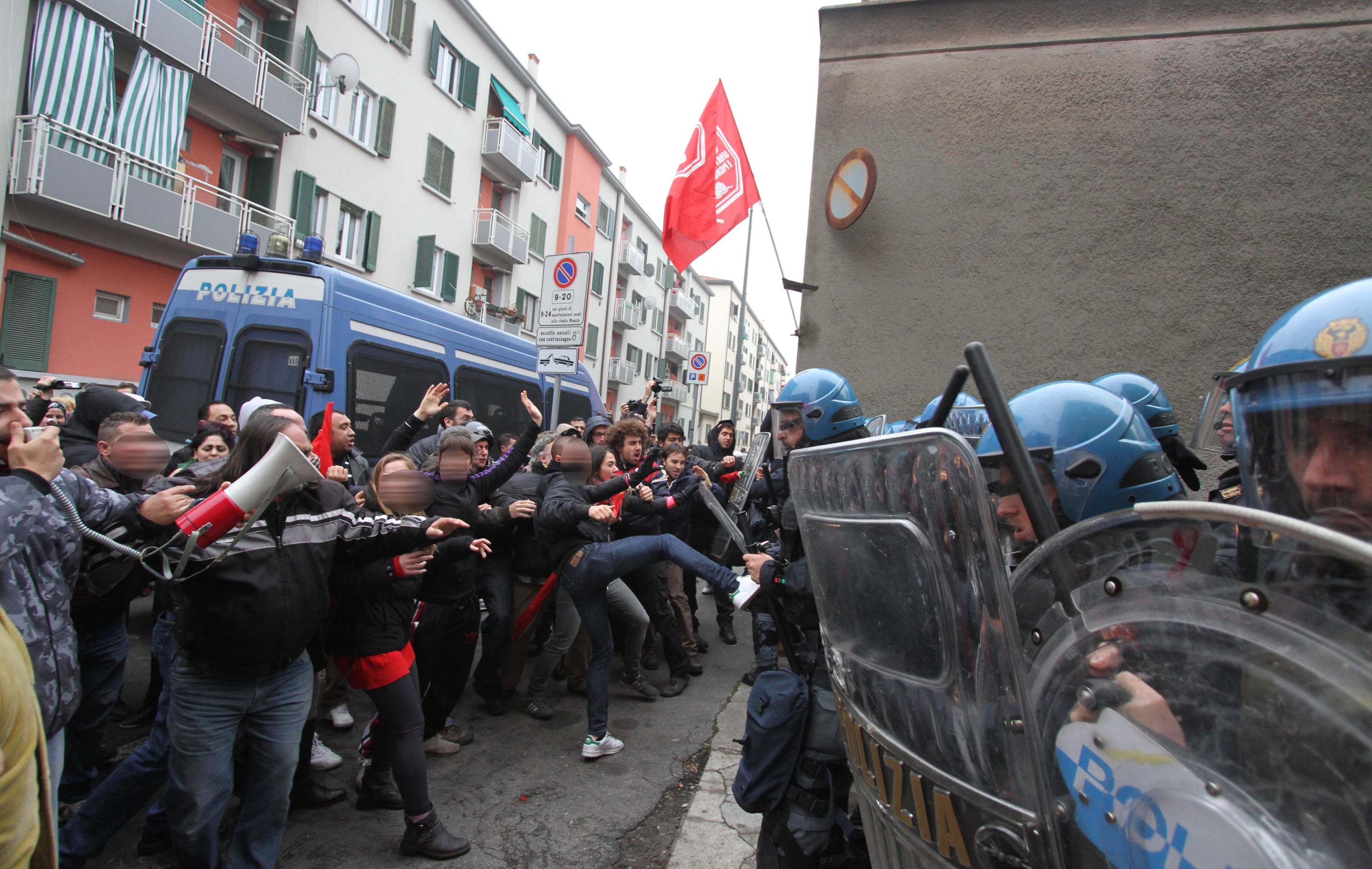 MILANO – Al civico 7 di via Tracia a Milano si ripete la stessa scena filmata decine di volte negli ultimi mesi nei quartieri popolari della città: davanti al cancello gli agenti in tenuta antisommossa, di fronte a loro un centinaio di contestatori tra militanti dei centri sociali e comitati per la casa pronti a tutto per bloccare lo sgombero di una famiglia di romeni. Finisce come al solito con un lancio di oggetti (e anche manciate di polvere di calce), con spintoni per entrare nel palazzo e un “respingimento” della polizia per allontanare i manifestanti dal cordone di sicurezza. La replica, in tono più pacato, di quanto avvenuto martedì durante lo sgombero in via Degli Apuli.
