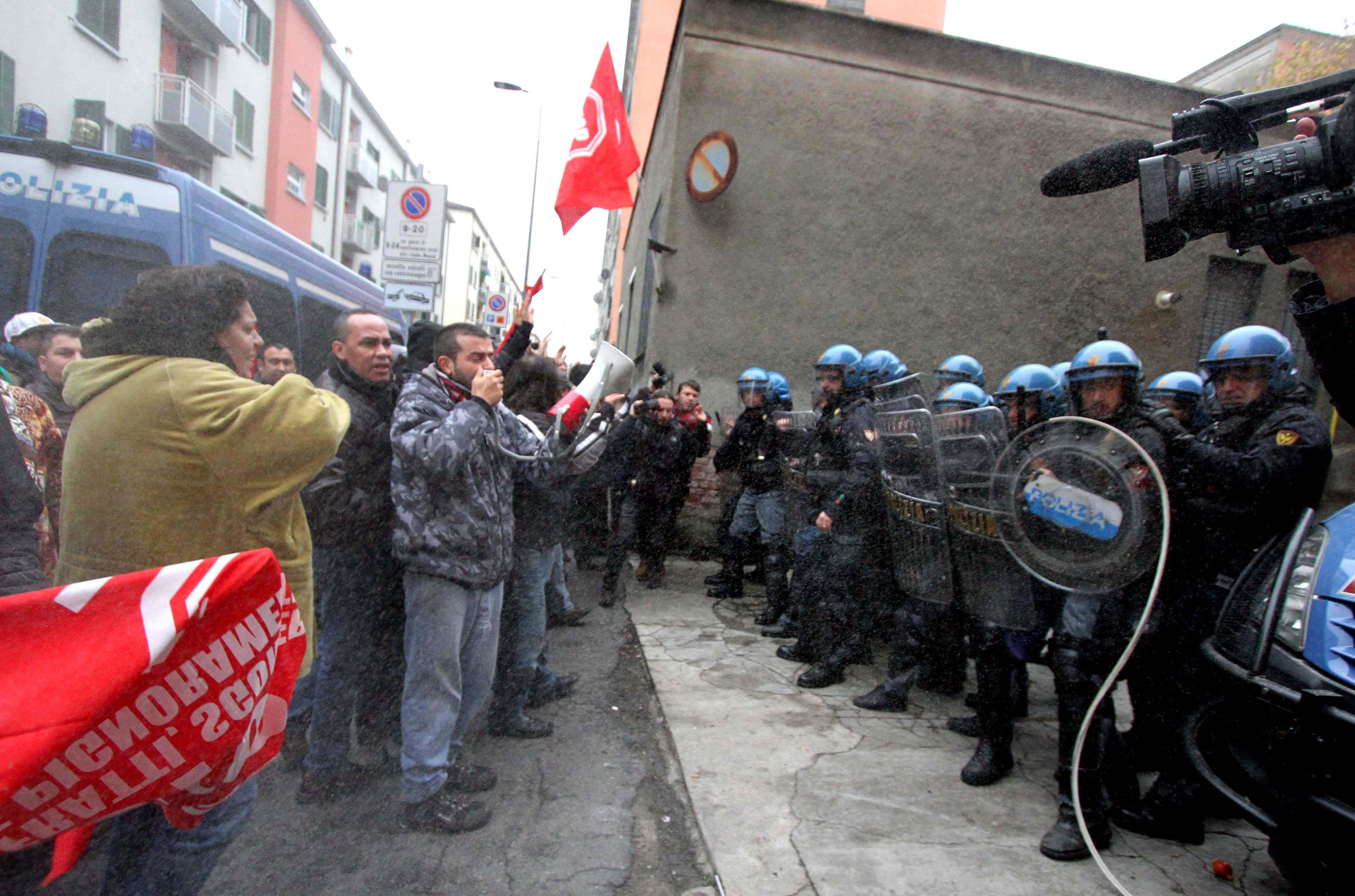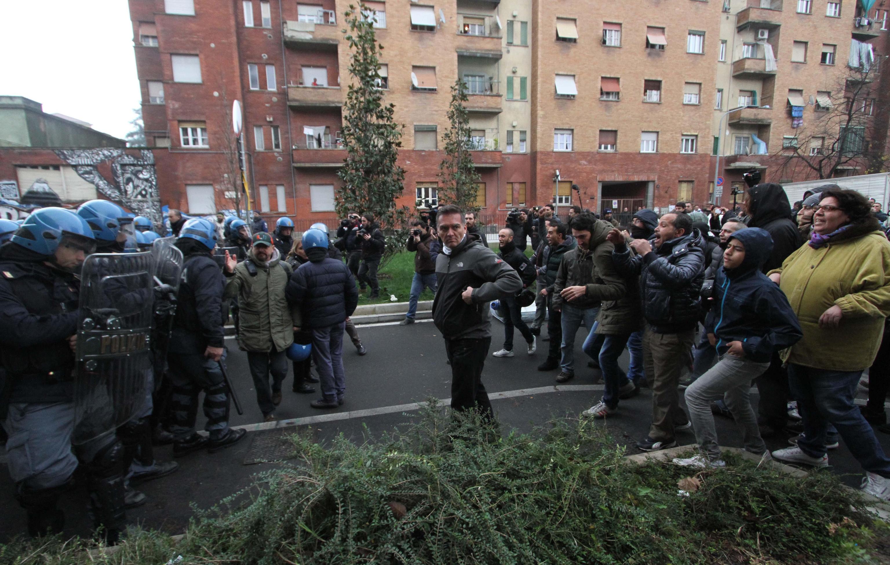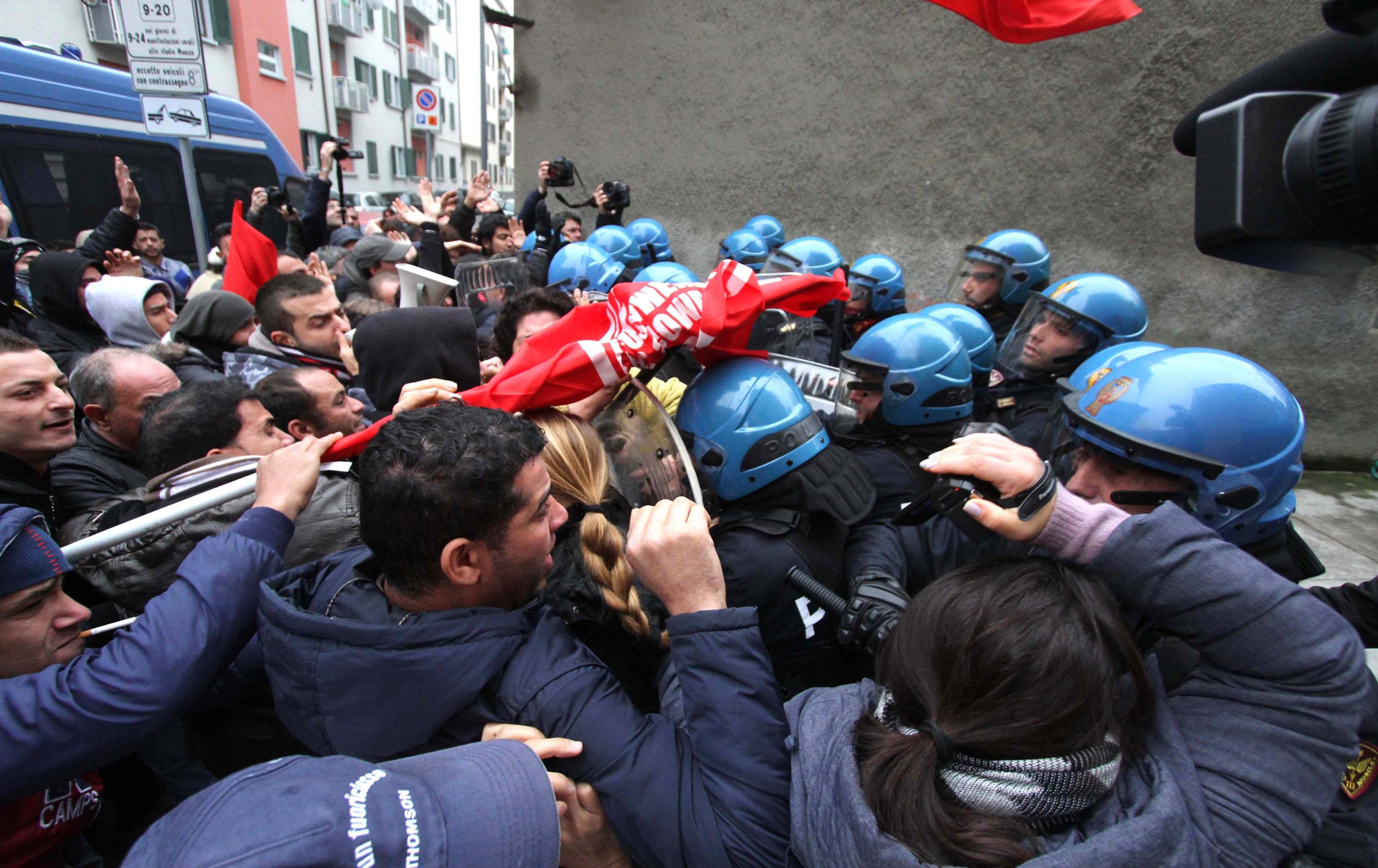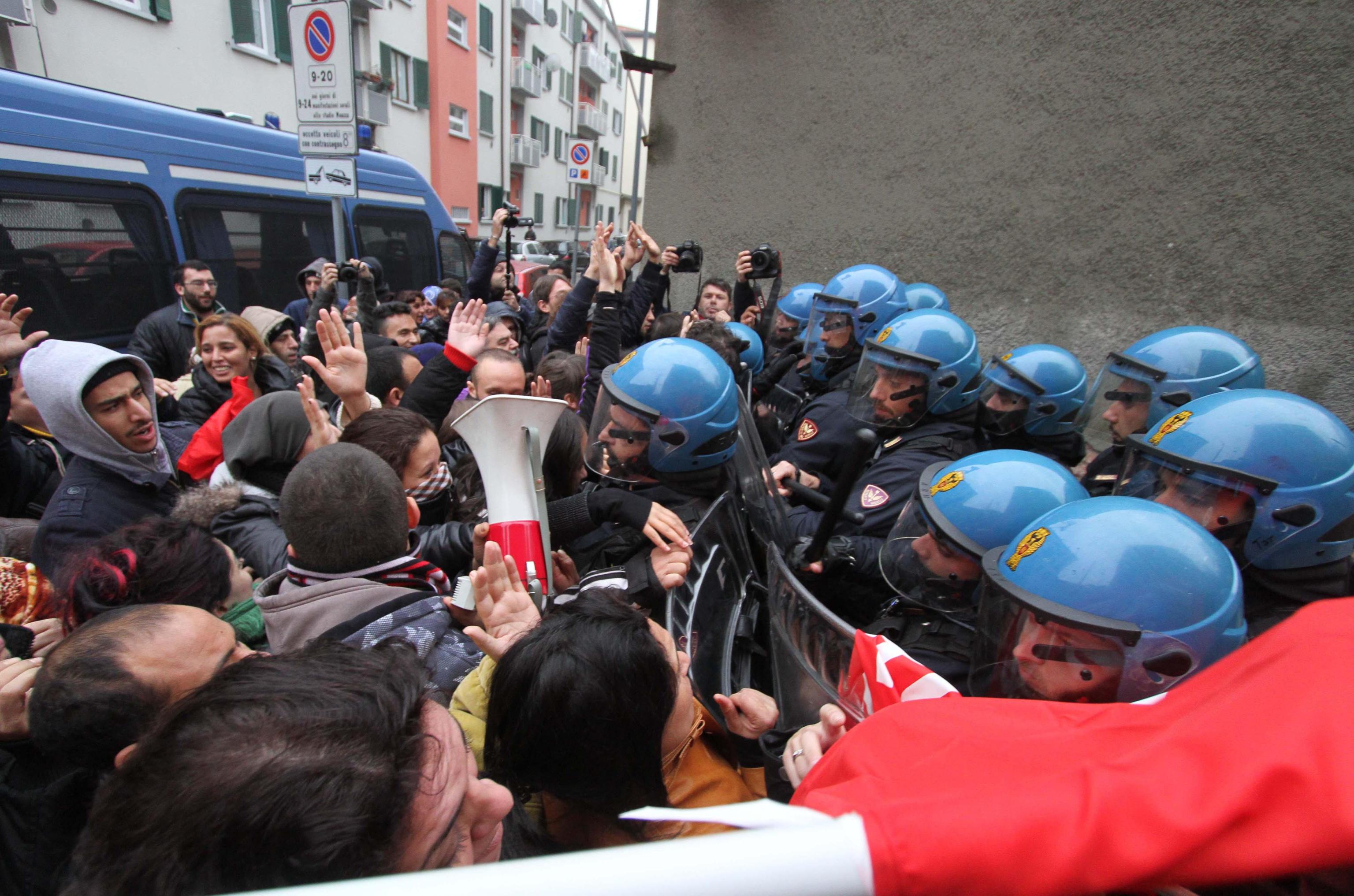 MILANO – Al civico 7 di via Tracia a Milano si ripete la stessa scena filmata decine di volte negli ultimi mesi nei quartieri popolari della città: davanti al cancello gli agenti in tenuta antisommossa, di fronte a loro un centinaio di contestatori tra militanti dei centri sociali e comitati per la casa pronti a tutto per bloccare lo sgombero di una famiglia di romeni. Finisce come al solito con un lancio di oggetti (e anche manciate di polvere di calce), con spintoni per entrare nel palazzo e un “respingimento” della polizia per allontanare i manifestanti dal cordone di sicurezza. La replica, in tono più pacato, di quanto avvenuto martedì durante lo sgombero in via Degli Apuli.
