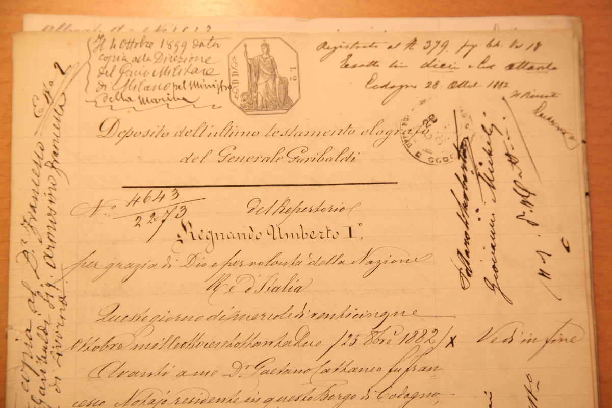 Al mio servitore Clemente Vismara, se, come suppongo, si troverà al mio servizio al momento della mia morte, lascio, per la ristrettezza del mio asse, la tenue somma di lire cento, in benemerenza de’ suoi fedeli e affettuosi servizi, dei quali consegno qui una piena attestazione, perché ne possa valere, quando creda che gli possa essere utile. Tale è la mia ultima volontà, che passo a sottoscrivere. Alessandro Manzoni testatoreGiuseppe Garibaldi