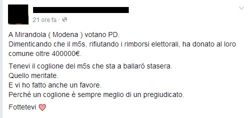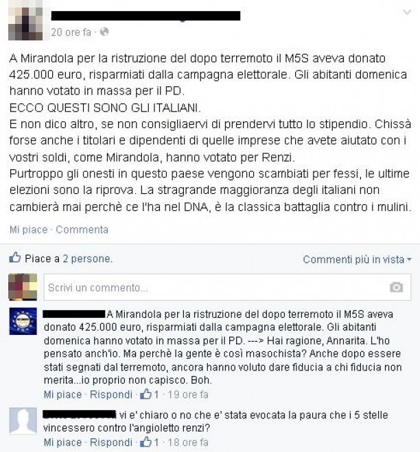 ROMA – “I terremotati di Mirandola sono degli ingrati. Hanno preso i 425mila euro donati dal Movimento 5 stelle e hanno comunque votato il Pd”. Su Facebook e Twitter gli elettori di M5s insorgono contro gli abitanti di Mirandola, che hanno dato al candidato di Beppe Grillo solo l’11% dei voti assegnando il Comune al Pd. Toni forti, quelli dei commenti, da cui i parlamentari del Movimento 5 stelle e lo stesso leader Grillo si sono dissociati.