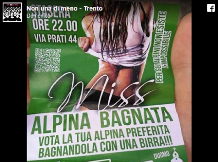 ROMA – “Vota la tua alpina preferita bagnandola con una birra”. Recita così un volantino distribuito durante la Adunata degli alpini. Sopra l’invito al concorso di bellezza “Miss Alpina bagnata”. [App di Blitzquotidiano, gratis, clicca qui,Ladyblitz – Apps on Google Play] Quello che però fa riflettere è la lunga denuncia di presentata da “Non una di meno – Trento” che segnala diverse molestie subite da alcune ragazze durante l’Adunata.