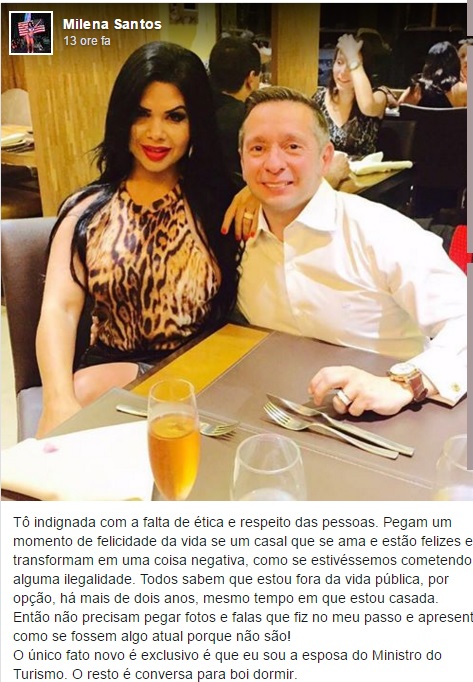 RIO DE JANEIRO – Il ministro del Turismo del Brasile ha la moglie che vanta un passato da miss Bumbum. La notizia è trapelata e Alessandro Teixeira, questo il nome del ministro, ora dà scandalo. La donna è la 30enne Milena Santos: la donna con un fisico imponente e un lato B scolpito forse anche grazie al silicone, è una ex miss Bumbum.