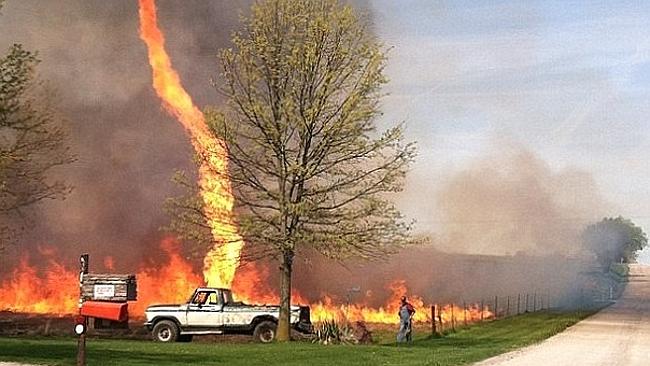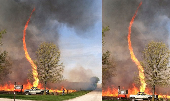 Nel caso fotografato dall’automobilista, ad aver appiccato le fiamme in un campo è stato un contadino. Il firenado, in questo caso non ha fatto danni.