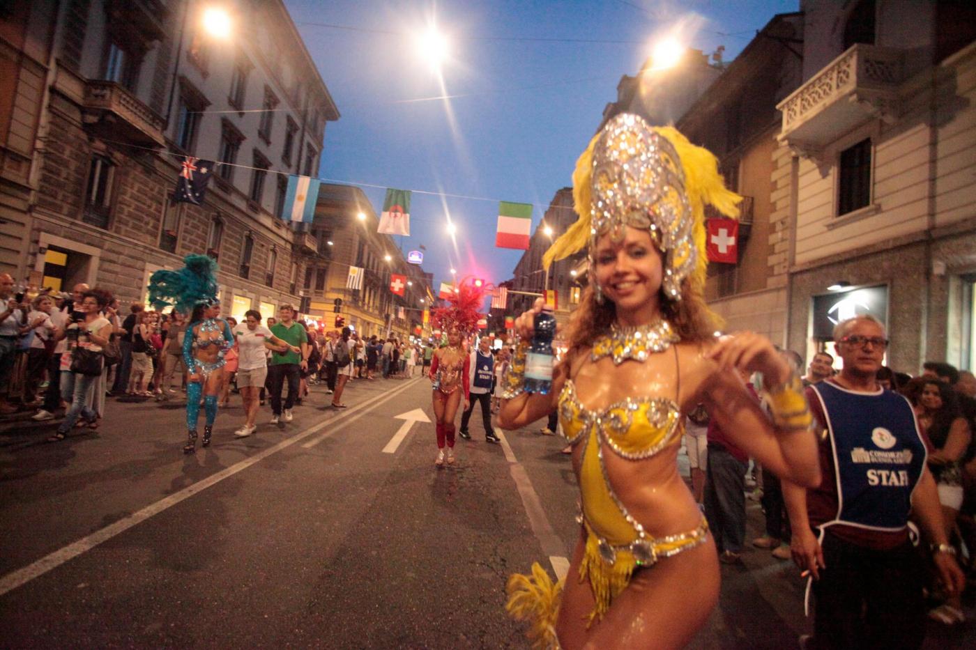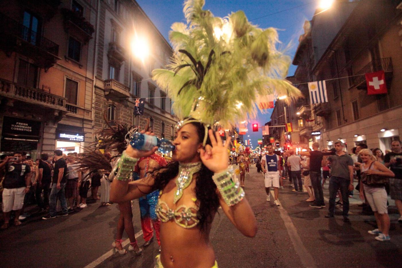 MILANO – Parata brasiliana a Milano per l’inizio dei Mondiali di calcio con tanto di ballerine, acrobati, capoeiristi, tifosi e musicisti, tutti sono scesi in strada per festeggiare il grande evento sportivo e per vedere la partita Brasile-Croazia tutti insieme, davanti a un maxi-schermo montato davanti al Castello Sforzesco.