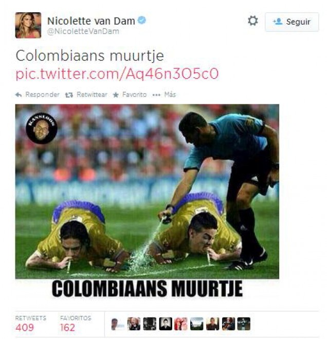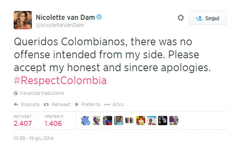 L’immagine pubblicata che alludeva alla produzione di cocaina nel Paese sudamericano, è stata subito cancellata da Twitter. Non sono bastate neanche le scuse ufficiali della Van Dam, sempre su Twitter, ai colombiani: l’attrice si è dovuta dimettere dal ruolo di ambasciatrice dell’Unicef.