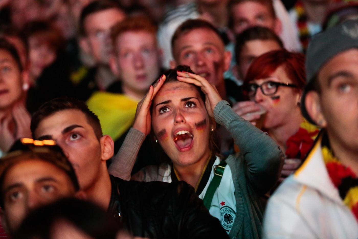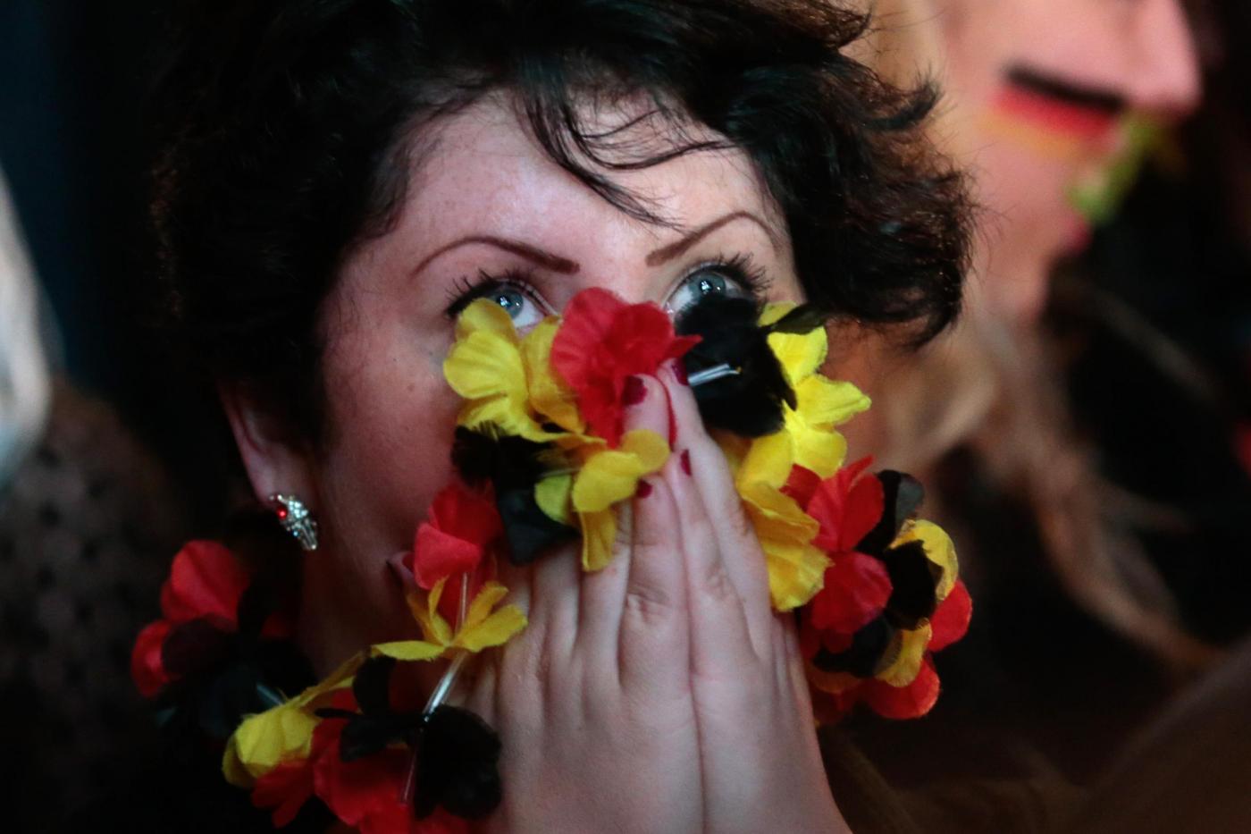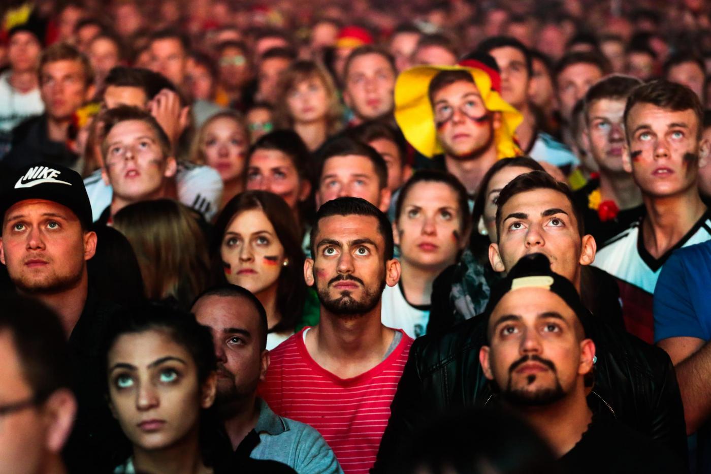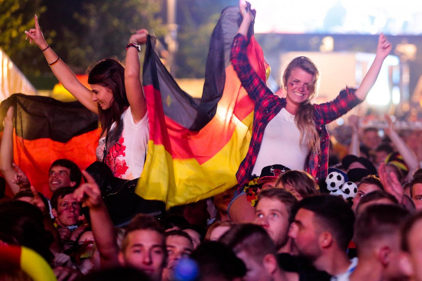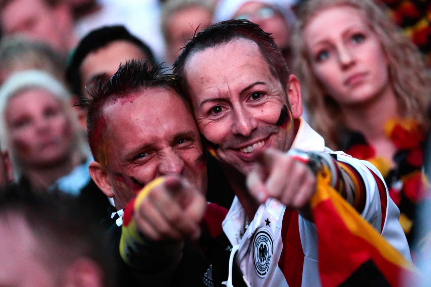 I dati ufficiali parlano invece di 300 mila tifosi lungo il Fanmeile, 1,2 km tinti di rosso giallo e nero, lungo la Strasse dedicata al 17 giugno, fra la colonna della vittoria e la celeberrima porta che divideva l’ovest dalla DDR. All’inizio ci sono per lo più i giovanissimi: la generazione nata nel Paese ormai riunificato, quella che non ha alcuna remora a sventolare la bandiera e ad ammainarla in qualsiasi forma, esibendola perfino disegnata sulle guance per due euro. La indossano, come gonna mantello parrucca berretto, si tingono i baffi dei suoi colori, immergono il volto nelle tre vernici. Hanno venti, venticinque anni, e la pioggia battente non li ha convinti a tornare a casa: bagnati fradici hanno tenuto duro per arrivare a godersi la vittoria, arrivata solo ai supplementari di una partita seguita col fiato sospeso.