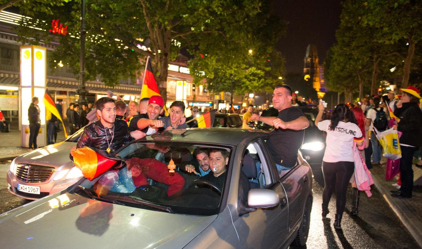Il Fanmeile più imponente delle Germania ha chiuso i suoi sei accessi un’ora prima della partita al public viewing, regalato ai berlinesi su decine di schermi. Ma subito dopo il gol che ha realizzato il sogno è la capitale intera a scendere per strada a festeggiare. Fiumi di birra e migliaia di curry wurst, perché qui il cliché è vita reale, e la gente si diverte davvero così. Nei quartieri di periferia si spara per ore, perché Berlino è in grado di farsi sentire coi botti, e di sorprendere coi fuochi, come se fosse una città di mare, una città del Sud. Lungo il celebre corso del Ku’damm, incastonato di firme e Porsche, caroselli clacson e motociclisti fanno da sfondo al delirio di una notte appena iniziata. ”80,8 milioni di cuori battenti oggi per voi”, titolava Bild stamani. ”Voi siete il papa, ma noi siamo gli dei”, era la sfida lanciata dal tabloid BZ.