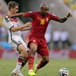 ROMA – Il Ghana mette alla frusta la Germania nel secondo turno del Girone G, costringendola al pari (2-2). Le Black Stars di Kwesi Appiah vanno in svantaggio con il gol di Mario Gotze al 6′ della ripresa, quindi pareggiano tre minuti più tardi con André Ayew ed al 18′ passano in vantaggio con Asamoah Gyan. Il solito Miro Klose, in campo da soli due minuti, al 26′ pareggia raggiungendo Ronaldo a quota 15 reti in un Mondiale.