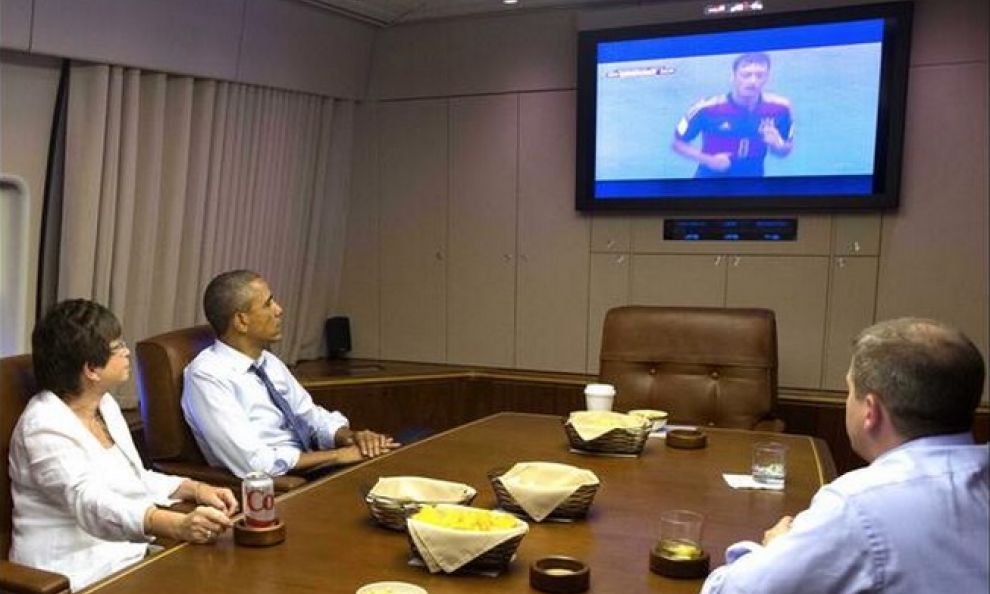 ROMA – Il presidente americano, Barack Obama, guarda a bordo dell’Air Force One la partita dei Mondiali Germania-Stati Uniti, vinta dai tedeschi per 1-0.