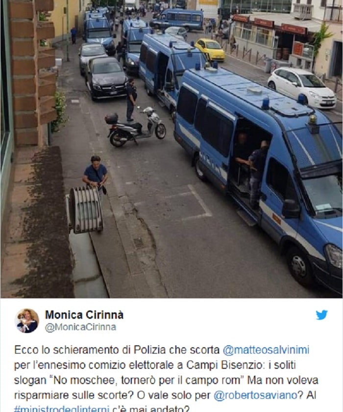 “Ecco lo schieramento di Polizia che scorta @matteosalvinimi per l’ennesimo comizio elettorale a Campi Bisenzio: i soliti slogan ‘No moschee, tornerò per il campo rom’. Ma non voleva risparmiare sulle scorte? O vale solo per @robertosaviano? Al #ministrodeglinterni c’è mai andato?”