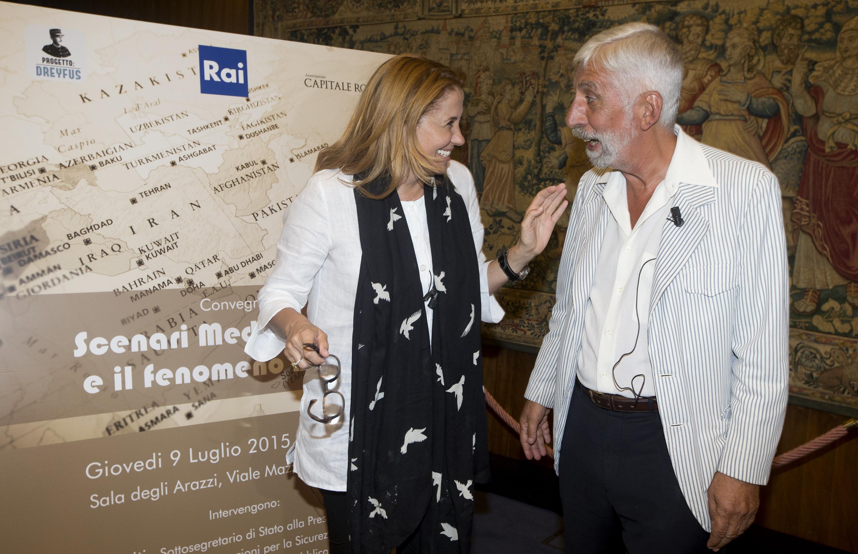 I giornalisti Monica Maggioni e Carlo Panella durante il dibattito su Scenari mediorientali e il fenomeno Daesh presso la sede RAI di viale Mazzini a Roma, 9 luglio 2015. ANSA/CLAUDIO PERI